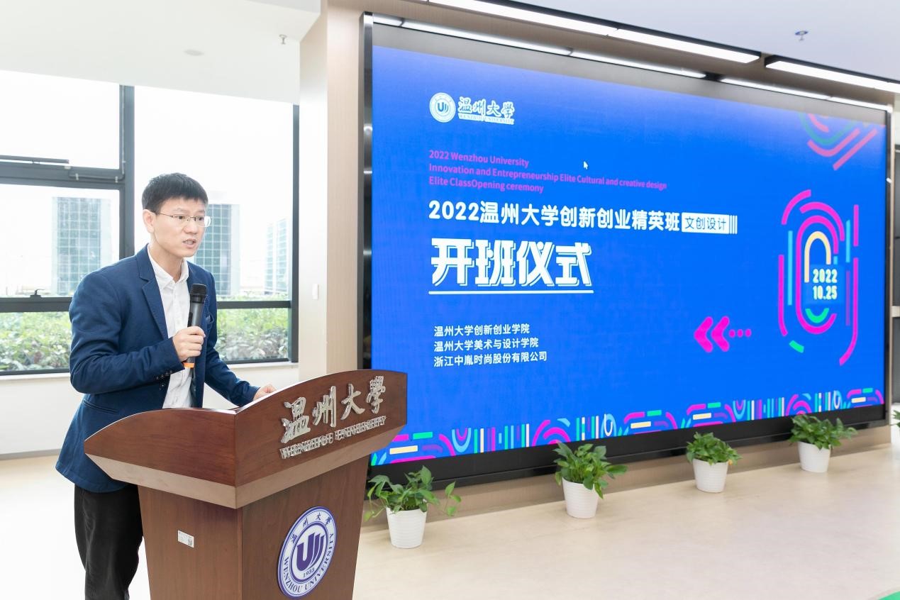 施永川院长发表创新创业精英班开班致辞。他介绍了温州大学创新创业教育办学特色和荣誉成果,展望了校企合作举办的“创新创业精英班(文创设计)”在推广专业教育与创业教育深度融合的美好愿景。