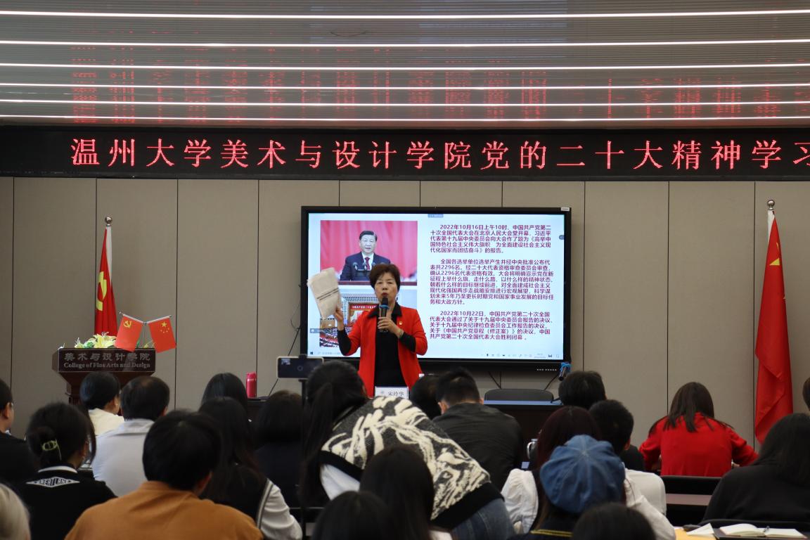 为深入学习宣传贯彻党的二十大精神,感悟思想伟力,汲取奋进力量,引导全院师生切实把思想和行动统一到党的二十大的精神上来,10月26日下午,禁忌书屋 组织开展党的二十大精神学习会,特邀党的十九大代表宋玲华同志为学院全体师生作“学习感悟党的二十大精神”专题宣讲报告。会议由学院党委书记叶正飞主持,近500名师生线上线下参加学习活动。 宋玲华老师是党的十九大代表,市妇联执委,瓯海区关工委主任,瓯海区慈善总会副会长,瓯海乡村艺术团联合会主席,宋玲华党代表工作室负责人,浙江省关心下一代报告团成员,温州银耀瓯越宣讲员,温州老干部大学流动红色能源站讲师,宋玲华宣讲工作室负责人。 学习会上,宋老师从一名党代表的视角、一名退休党员的视角、一名公益先锋的视角,全面分析讲解党的二十大报告内容,分享了二十大精神的内涵理解和学习体会。她指出党的二十大是在全党全国各族人民迈上全面建设社会主义现代化国家新征程、向第二个百年奋斗目标进军的关键时刻召开的一次十分重要的大会,是一次高举旗帜、凝聚力量、团结奋进的大会,在党和国家发展进程中具有极其重大的历史意义。党的二十大报告,为党和国家事业描绘了清晰的发展路线,擘画了宏伟的发展蓝图,充分彰显了我们党坚如磐石的历史自信、举旗定向的政治担当和高瞻远瞩的战略视野,是我们党团结带领全国各族人民在新时代新征程坚持和发展中国特色社会主义的政治宣言和行动纲领。 “我要把党的‘好声音’传递到基层群众,传递给青年学生,这是我的职责和使命。”宋玲华老师在宣讲过程中也分享了多年来践行一名共产党员初心使命的经历,从丰富地方群众的文化生活到宣讲低碳环保的生活方式,从省吃俭用捐助困难群众到关爱帮扶失足少年,从退休党员干部到十九大党代表……,希望通过自己的付出和行动,带动更多人做对社会有益的事。 学习会上,宋玲华老师用习总书记的话“青年强,则国家强!”来勉励师生党员,要坚定不移听党话、跟党走,怀抱梦想又脚踏实地,敢想敢为又善作善成,立志做有理想、敢担当、能吃苦、肯奋斗的新时代好青年,让青春在全面建设社会主义现代化国家的火热实践中绽放绚丽之花。 叶正飞书记总结指出,学习好宣传好贯彻好党的二十大精神是当前和今后一个时期学院的首要政治任务。新时代新征程,全院师生要深学细悟党的二十大精神,要把坚决拥护“两个确立”转化为坚决做到“两个维护”的实际行动,要聚焦“争当表率、争做示范、走在前列”光荣使命,奋力推动学院高质量内涵式发展,为全面建设社会主义现代化国家、全面推进中华民族伟大复兴作出更大贡献!