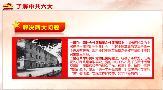 二、时局发生了重大的变化:五大结束后,1927年7月15日汪精卫背叛了革命,实行反共,蒋介石和汪精卫就联合起来镇压共产党,整个中国形势发生了巨大的变化。共产党面临严峻的形势,在这个情况下怎么来判断中国革命形势、性质、任务和前途,需要党迫切做出一个准确的回答,这要求党要召开另一次代表大会。
