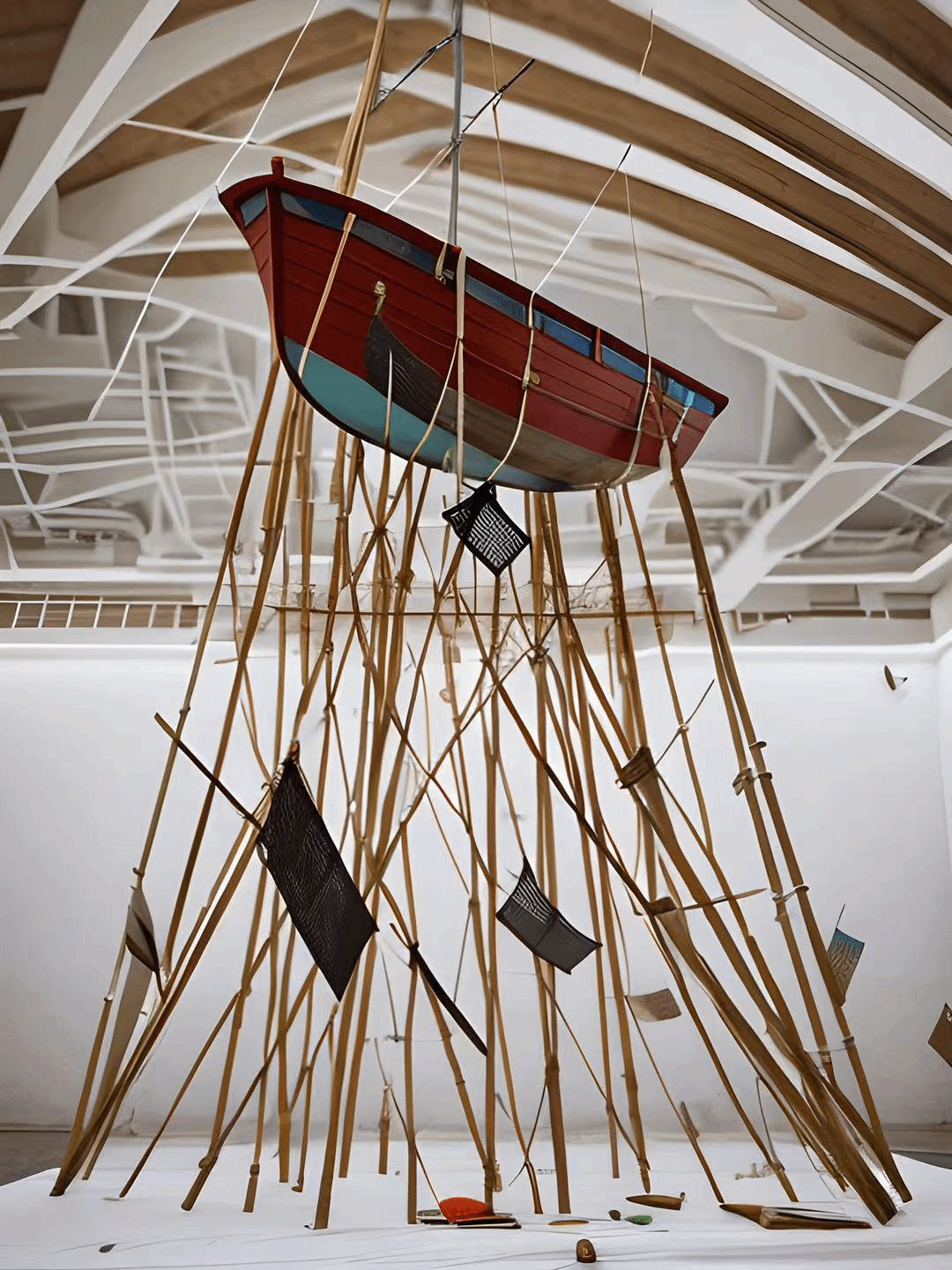 灵感说明:通过废弃竹子、铁丝和渔网制作了整个作品,呼应了废物利用的主题。青,生命之色,东方之色。艺术装置打破原有固定思维,参照古典的船体元素,运用钢丝构造船骨架,用竹子打造海浪的节奏,与当代材质碰撞,富有形式感的异形结构相互错位,嵌套,让其充满秩序感。