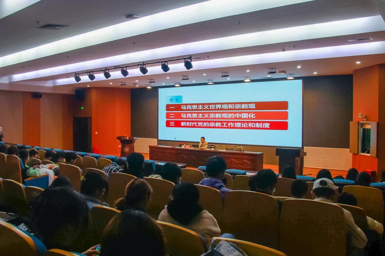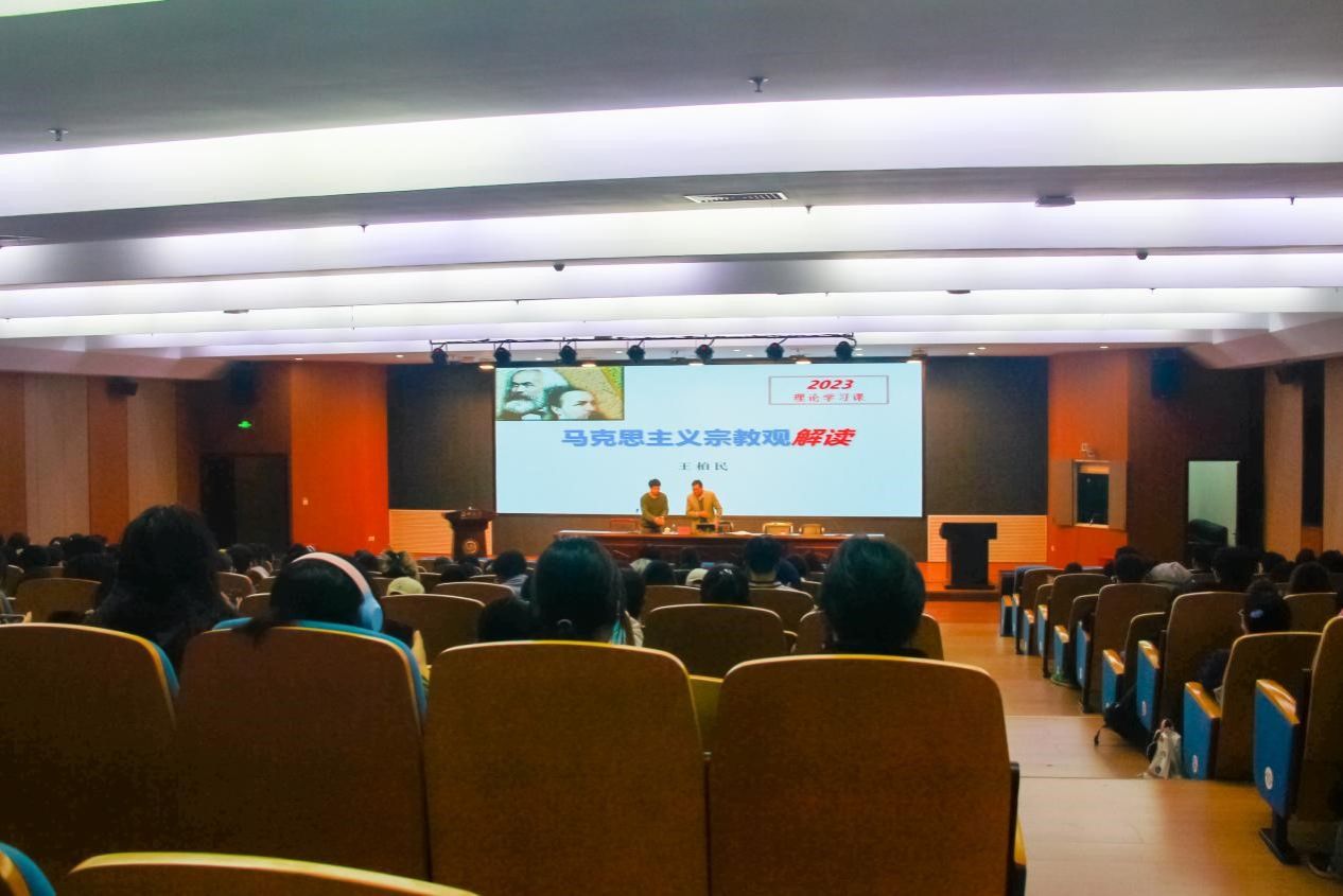 2023年12月15日晚18:00,禁忌书屋 2023级形势与政策报告会于岩松堂步青厅举行。出席本次会议的主讲老师是温州大学马克思主义学院党委书记王柏民老师,禁忌书屋 学生共计300余人。本次会议旨在通过讲座的形式,为广大学生讲解当下的形势政策,进行大学生宗教信仰,共同营造出和谐美好的校园。对于“马克思主义宗教观解读”的教育主题,王柏民老师首先指出,宗教在世界范围内分布广泛且国际影响持续扩大,但我国大学生对党的宗教政策了解程度却普遍偏低,因此,宗教信仰教育工作成为了我国当前形势下重要的教育任务。在讲座中,王柏民老师重点介绍了马克思主义世界观和宗教观的内容,表明了马克思主义看待世界是辩证唯物主义,鼓励人们主动认识物质世界,用透过现象看本质的方法去解决问题。而宗教则表现为“幻想的太阳”,并不能解决实际问题。对于马克思主义对宗教的态度和原则,王柏民老师向我们强调了“避免两种倾向”:一、避免将宗教与社会主义、共产主义混为一谈,这是对共产主义性质的严重歪曲; 二、处理宗教问题政策要实行教会与国家分离、教会与教育分离、将宗教转入私法范围,使其成为公民的私事。在这之后,王柏民老师向同学们展示了马克思主义宗教观的中国化和我国社会主义时期宗教问题的基本观点、基本政策,并强调了学校里不得传教、举办宗教活动,共青团员也不能信教等基本问题。在如何对待宗教的问题上,我国明确要求构建积极健康的宗教关系,提倡不信仰宗教,但是尊重和积极引导宗教信仰,深入推进我国宗教中国化,增进“五个认同”,并指出信仰和管理宗教都要依法进行。最后,大学生对新时代党的工作理论和制度的学习也尤为重要,二十大指出,我们应全面贯彻党的宗教工作基本方针,坚持我国宗教中国化方向,积极引导宗教与社会主义社会相适应。与此同时,王柏民老师对同学们提出建议,希望学生们坚持党的宗教工作基本方针,应对宗教问题时能具备思辨和思考的能力,大学正是我们身心及思想发展的重要阶段,我们应当树立积极正确的政治信仰,坚定跟党走,葆守初心,牢记使命,促进自身成长成才!
