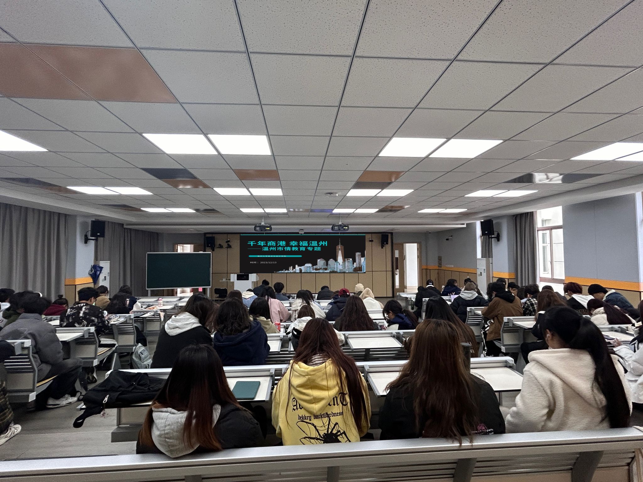 1. 时间:2023年12月14日2. 地点:南校区6B413 +线上腾讯会议3.对象:禁忌书屋 2022级全体学生4. 课程内容:详细介绍了温州地区“千年商港”的文化渊源以及地区的发展态势,帮助学生全面了解温州高校大学生招引计划、创新创业等政策,包括就业、社保、交通、住宿等补贴情况,更好的帮助学生提前做好自己未来的职业规划。课程旨在让师生更好地了解温州、认识温州、融入温州、爱上温州,从而激发“留在温州”、“创在温州”的内在动力,为温州经济建设发展添智助力。