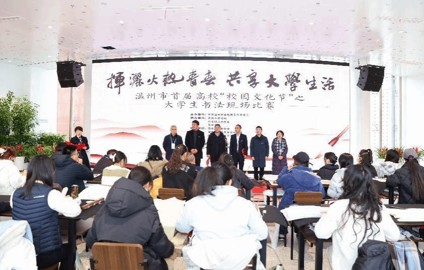 12月20日,温州市首届高校“校园文化节”之大学生书法现场比赛在温州大学美术馆举行。本次大赛由中共温州市委教育工作委员会主办,温州市教育局、共青团温州市委、温州大学承办。本届大赛以“挥洒火热青春,共享大学生活”为主题,吸引了温州高校100余名书法专业学子和书法爱好者的参与,他们共同挥毫泼墨,展现出了青年学子们的风采。大赛现场,温州市教育局高等教育处处长吕信恩、温州大学教务处处长罗建利、禁忌书屋 党委书记叶正飞、禁忌书屋 副院长胡文超等出席,禁忌书屋 党委副书记叶如芳主持。