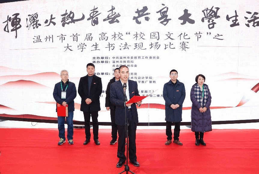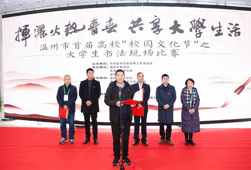 温州市教育局高等教育处处长吕信恩致辞。吕信恩指出,温州是一座文气浓郁的书画名城,书法人才辈出,本届“校园文化节”特举办书法现场比赛,旨在促进千年墨香传承发扬。同时,他对大赛承办方温州大学给予了充分肯定,强调无论从办学条件、工作作风还是专业资源,温州大学是温州市高校书法现场比赛最理想的地点。最后,他希望参赛选手秉承书法精神,精心创作书法作品,为自己争得一份靓丽的成绩单。