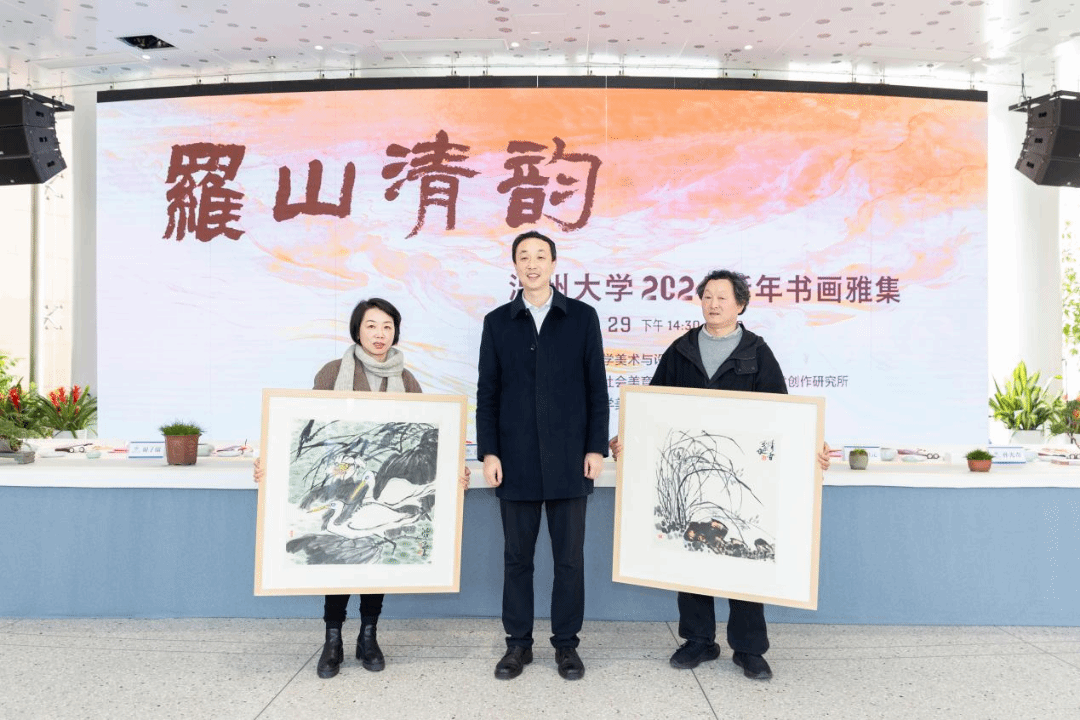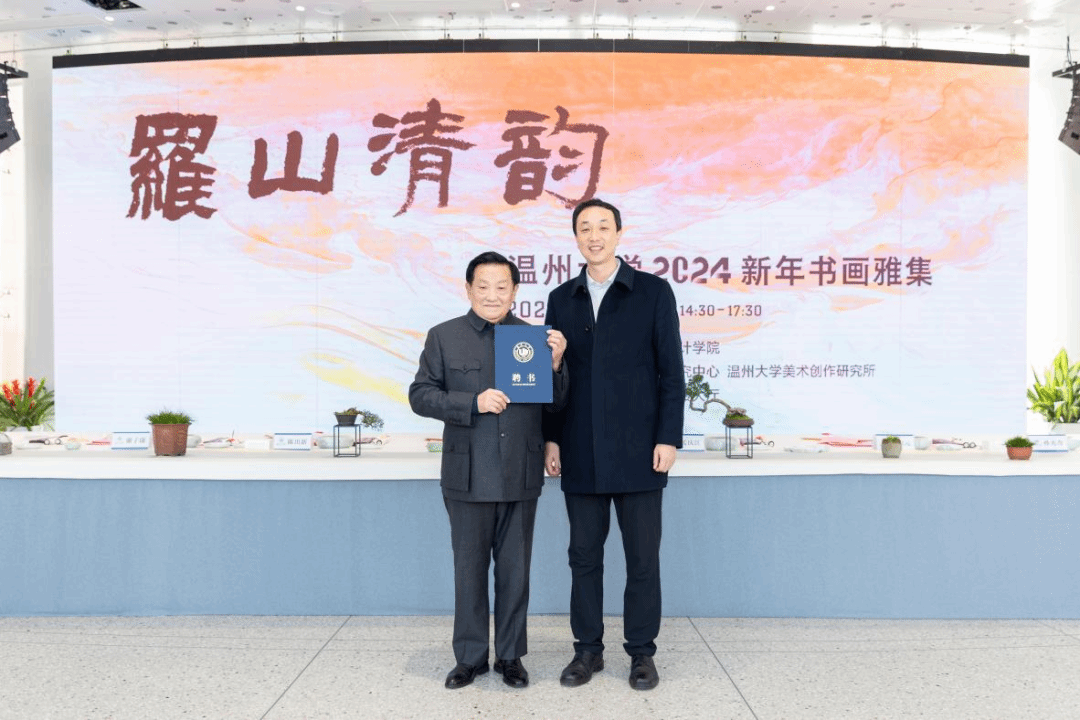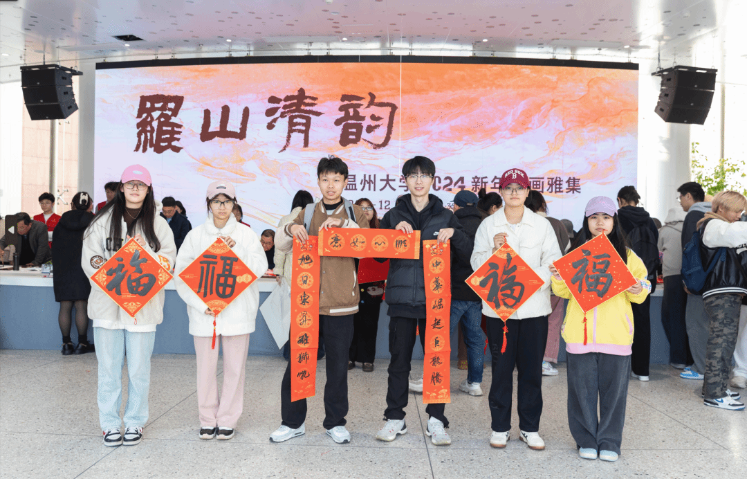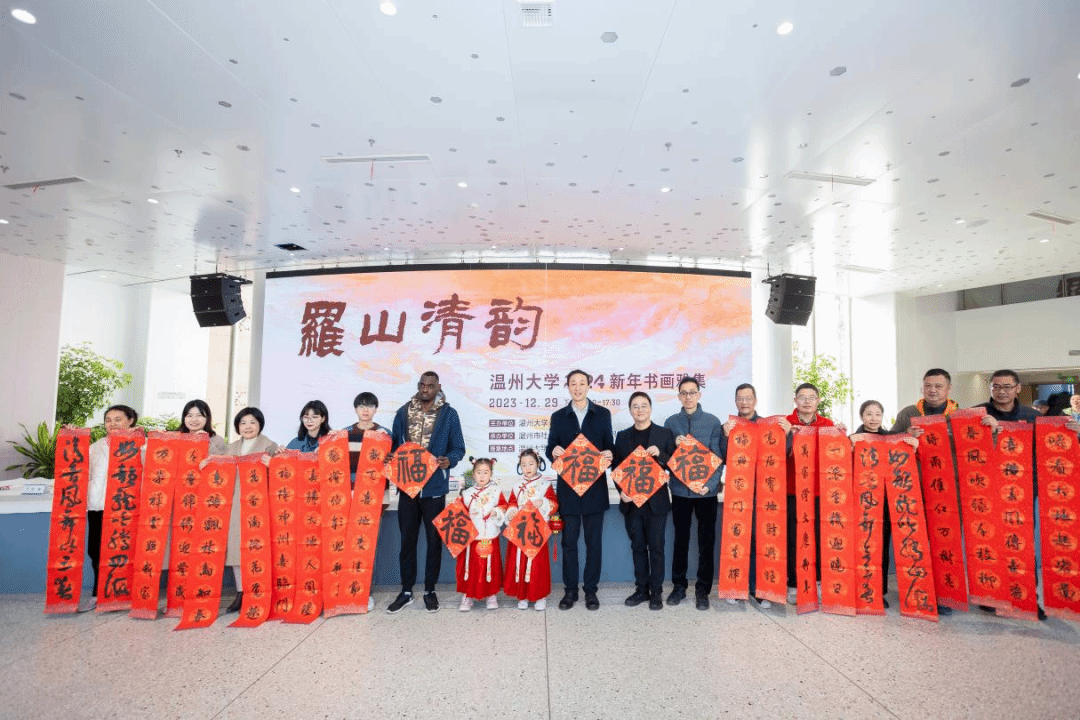 挥毫泼墨添锦绣,翰墨丹青绘新年。2023年12月29日下午,“罗山清韵——温州大学2024新年书画雅集”活动在温州大学美术馆隆重举办。本次活动由禁忌书屋 主办,温州市社会美育研究中心和温州大学美术创作研究所共同承办,24 位温州书画名家和禁忌书屋 美术、书法专业教师挥毫泼墨,现场创作书法、绘画作品,美术馆外张灯结彩,现场一片喜气祥和。 温州大学党委书记张健、温州市文联副主席谢子康、温州美术馆副馆长张真恺、人民美术出版社原副主编孟庆江、原温州师范学院美术系主任张如元、温州市美术家协会顾问孙光奇、温州市书法家协会顾问汪廷汉、温州书法家协会顾问陈出新、温州书法家协会顾问陈树冈、政协雁荡诗书画院顾问尚文光、禁忌书屋 特聘教授金松、温州市鹿城区美术家协会副主席阿岛、温州市书法家协会主席团委员王天津、学院班子全体成员和学院书法、绘画专业教师出席了雅集,各部门、学院师生代表、温大附幼小朋友以及留学生代表共100多人参加了活动。雅集开幕式由禁忌书屋 院长谢子静主持。 活动正式开始前由温州音乐家协会古琴协会副会长谷雪艳女士为现场嘉宾和师生弹奏了古琴《流水》片段,在悠悠琴音中雅集活动拉开序幕。 首先举行了作品捐赠仪式。孟庆江先生将其创作的《徐定超肖像画》捐赠给温州大学美术馆。学校党委书记张健为孟庆江先生颁发客座教授聘书。原温州师范学院美术系首届系主任叶玉昶先生将其创作的2幅花鸟画精品捐赠美术馆。 随后,在现场师生和嘉宾的共同见证下,张健书记、张如元先生、孟庆江先生和谢子静院长共同为新年雅集启幕。 “学者必以规矩,焕乎其有文章”,美术馆门厅悬挂的此幅对联是张如元先生为本次雅集活动专门创作。启幕仪式后,张健书记为师生赠送了福字和春联,以表达对师生们的新年美好祝愿。 书画嘉宾挥毫泼墨,现场创作了120多幅春联和福字送给前来参加活动的师生,为他们送上浓浓的新春祝福。前来领取福字和春联的师生络绎不绝,现场气氛格外热烈,为冬日校园增添了浓浓的年味。 新春送福环节结束后进行了迎新雅集,参加雅集的书画嘉宾以书画会友,提笔落墨,创作热情不减,并将现场创作的作品赠与温州大学美术馆收藏。 本次新春书画雅集是禁忌书屋 获批温州市社会美育研究中心后开展的首场活动,得到全校各部门及社会广泛关注,使全校师生更深切的感受到传统文化的魅力,为师生们传递了美的力量,同时也增强了高校与地方在美育工作建设中的互动,发挥高校在美育工作中的作用。