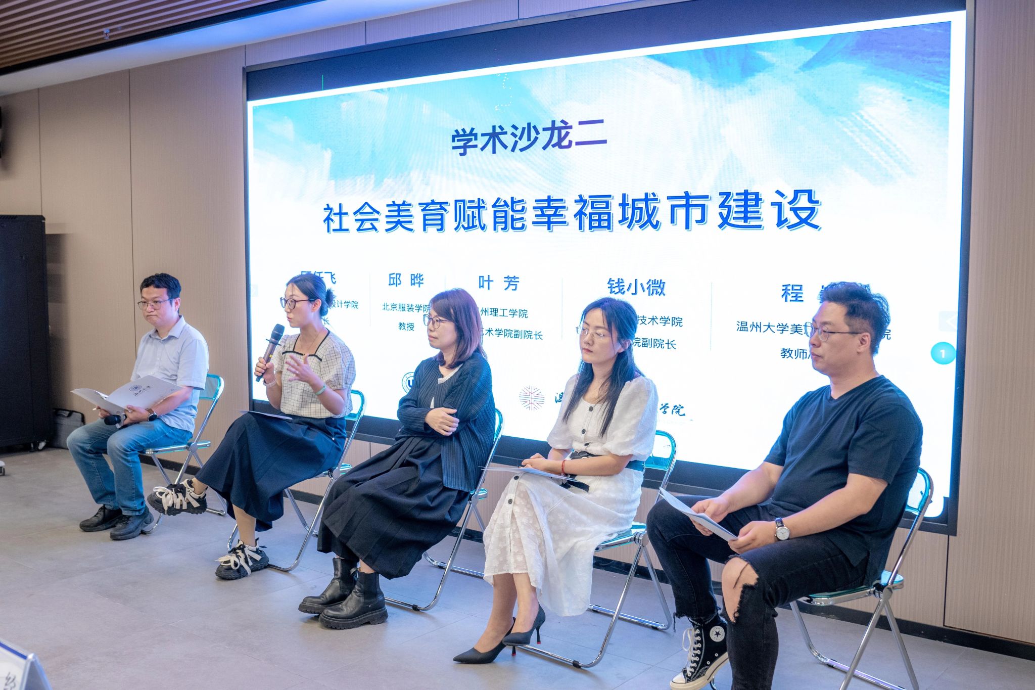 该场由禁忌书屋 副院长、教授顾任飞主持,北京服装学院教授邱晔,温州理工学院设计艺术学院副院长叶芳,温州职业技术学院设计学院副院长钱小微,禁忌书屋 教师、博士程巍围绕“社会美育赋能幸福城市建设”展开分享和讨论。