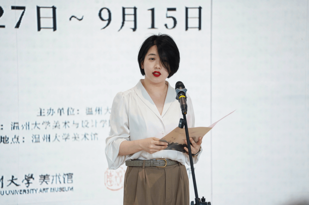 黄达聪孙女黄为为在致辞中首先回忆了儿时陪伴祖父创作的场景。黄为为指出,祖父对故土有着深深地眷恋。黄氏祖辈与温州大学更是有着深厚的渊源,曾祖父黄溯初先生捐建了温州大学前身温州师范学院,如今,温州大学能够举办黄达聪师友书画展即是天假其便,更是多方共同努力的好事情,并祝愿温州大学未来争创更多佳绩。