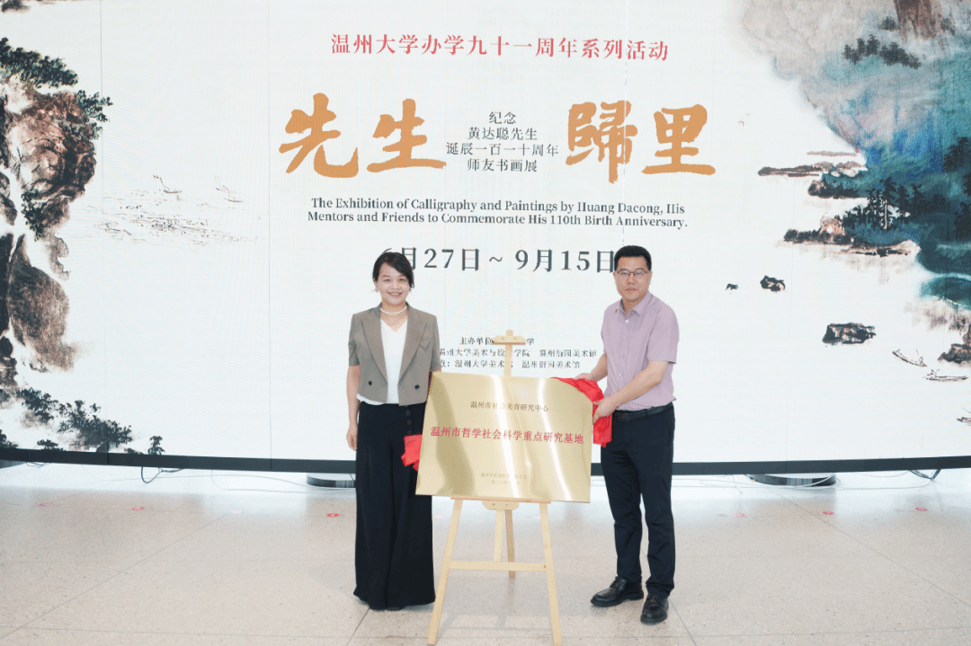 温州市社科联副主席叶雪影、温州大学人文社科处处长胡瑜共同为温州市哲学社会科学重点研究基地“温州市社会美育研究中心”揭牌。
