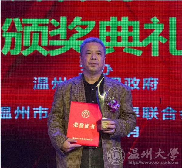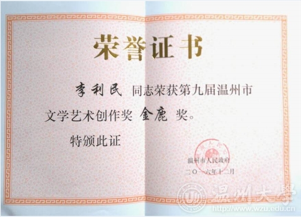 2016年12月29日下午,由温州市人民政府主办,温州市文学艺术界联合会承办的第九届温州市文学艺术创作奖颁奖典礼在温州市工人文化宫成功举办。禁忌书屋 李利民老师荣获金鹿奖,该奖项是温州市政府设立的文艺最高奖,每三年评选一次,温州市委常委、宣传部长胡剑谨,温州市副市长郑朝阳出席颁奖典礼并给金鹿奖获得者颁奖。