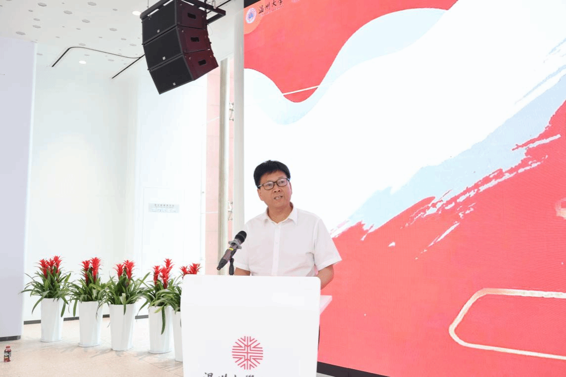 首先温州大学党委副书记庄兴忠致辞,庄兴忠表示,江浙文化底蕴深厚,温州作为千年古城,非遗资源丰富。此次展览以现代设计为笔、温州非遗为墨,既是禁忌书屋 “以美育人” 教学实践成果的集中展示,也旨在推动传统文化与现代理念融合,让非遗在新时代焕发新生。学院多年来鼓励学生从本土非遗中汲取灵感,将创意转化为文创产品,此次展览便呈现了师生们的创新成果。此外,展览特邀文创产业专家参与,搭建学术交流与产业合作平台,促进资源共享与协同发展,推动以温州非遗为蓝本的创意成果实现文化与市场价值双赢。庄兴忠强调,以文创为桥梁打造文化高地,是传承中华优秀传统文化、满足群众精神需求的重要路径。