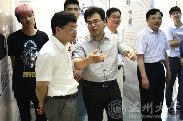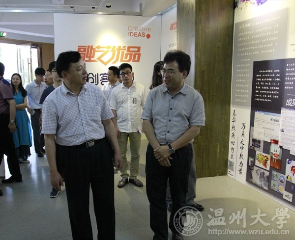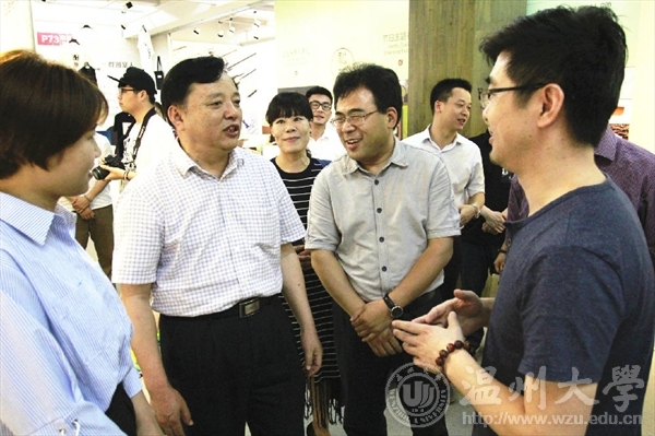 6月15日上午,全国创新创业50强评审专家陈年友、李斌、陈学军、陈森一行来禁忌书屋 学生创新创业实践场地参观和实地考察,校党委副书记牟德刚、副校长薛伟及相关部门负责人等一行领导陪同参观调研了温州时尚学院和“融艺优品”创客空间的创新创业项目。