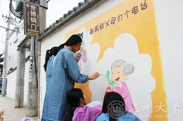 为了进一步响应与落实市委“新青年下乡”主题精神,弘扬传统孝道美德,美院志愿者们携手教师教育学院的“小老师们”一同参加了“乐清市绘二十四孝墙绘”的活动。