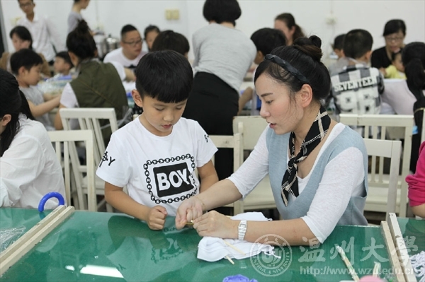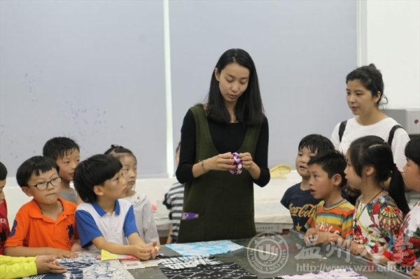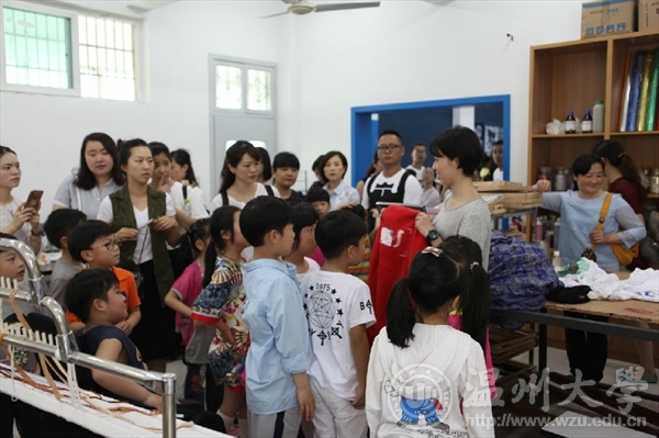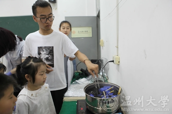 杨老师向大家介绍了温州大学美术学院印染实验室。张老师向家长孩子们介绍了“扎染”的发展历史,展示了五颜六色的扎染成品。孩子们都全神贯注的看着,还积极的向老师询问扎染的方法。扎染古称扎缬、绞缬、夹缬和染缬,是中国民间传统而独特的染色工艺。 其工艺特点是用线在被印染的织物打绞成结后,再进行印染,然后把打绞成结的线拆除的一种印染技术。它晕色丰富,变化自然,趣味无穷。更使人惊奇的是扎结每种花,即使有成千上万朵,染出后却不会有相同的出现。这种独特的艺术效果,是机械印染工艺难以达到的。