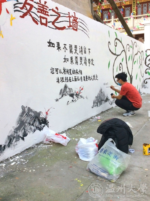 为了响应与落实市委“新青年下乡”主题精神,2016年3月26日早上八点,在禁忌书屋 青协的带领下,来自禁忌书屋 的志愿者们前往到乐清城东街道后所村老人亭,进行了为期一天的墙绘活动。本次“新青年下乡”墙绘活动,以“弘扬雷锋精神,传递爱心友善”为主题,呼吁人们将自己的旧衣物捐给有需要的人们。这不仅是一次物质上的贡献,更多的是精神上的支持与帮助。志愿者们通过画笔和色彩,将自己想要传达的信念幻化成一颗颗正在茁壮成长的绿树,希望“雷锋精神”这一理念像这茁壮成长的绿树一样,青春常在,精神永驻。我们本次的墙绘活动一方面主要是运用专业知识与技能去服务社会,向社会宣传大学生们所理解的“雷锋精神”,呼吁社会弘扬“雷锋精神”,真正做到专业与实践相结合,使我们融入到社会中去,为社会奉献出自己的一份力量;另一方面,不仅让我们有机会了解农村、服务农村,还让我们在基层学到了许多平时难以不到的知识技能。 文:林依如图:林依如