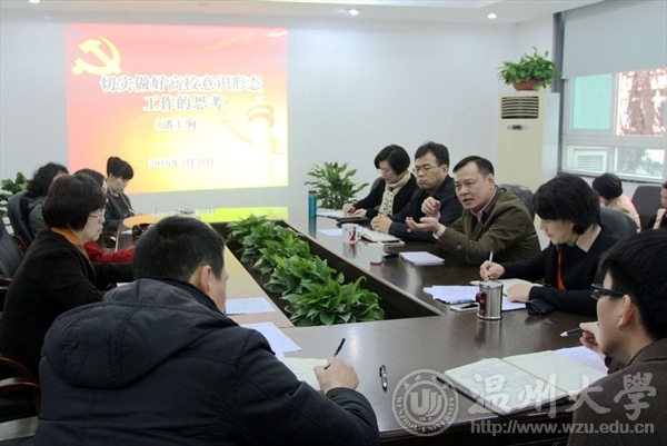 为了切实做好学院意识形态工作,进一步增强基层党员干部理论素养,3月30日,禁忌书屋 党总支召开全体党员理论学习会(中心组理论学习扩大会会议) ,特邀温州大学党委委员、宣传部部长潘玉驹做高校意识形态专题讲座。学院总支书记张丽萍主持学习会。