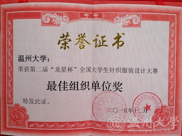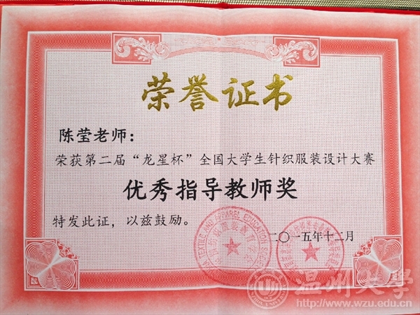 2015年12月13日,由教育部高等学校纺织类专业教学指导委员会和中国纺织服装教育学会主办、东华大学承办的第二届“龙星杯”全国大学生针织服装设计大赛颁奖典礼在东华大学举行。禁忌书屋 12服装设计班的5名同学在陈莹老师的指导下参赛并获奖项,其中,叶冰如的作品《共生》系列获二等奖、罗璇的作品《异构空间》系列获三等奖和朱芮萱的作品《迷雾》系列获三等奖,罗勇超、徐梦然作品获优秀奖。温州大学获优秀组织奖,陈莹老师获优秀指导教师。