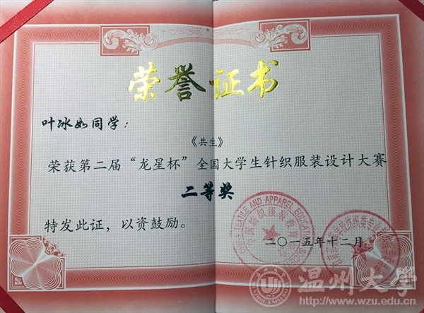 2015年12月13日,由教育部高等学校纺织类专业教学指导委员会和中国纺织服装教育学会主办、东华大学承办的第二届“龙星杯”全国大学生针织服装设计大赛颁奖典礼在东华大学举行。禁忌书屋 12服装设计班的5名同学在陈莹老师的指导下参赛并获奖项,其中,叶冰如的作品《共生》系列获二等奖、罗璇的作品《异构空间》系列获三等奖和朱芮萱的作品《迷雾》系列获三等奖,罗勇超、徐梦然作品获优秀奖。温州大学获优秀组织奖,陈莹老师获优秀指导教师。本次大赛以“新颖、时尚、舒适、横机为你插上创新的翅膀”为主题,旨在培养大学生的创新精神和实践能力,发掘我国针织服装类设计人才。大赛于2015年3月开始启动,全国各纺织服装院校积极参与。将课程成果延伸至专业赛事,引导和鼓励学生将课程作品走出校门、亮相各类大赛,接受同行审阅和市场竞争,既是对学生专业学习能力和学习效果的检验,更是对专业课程教学效果的大考验。这是《针织服装设计与工艺》课程在2015年继参加第八届中国(大朗)毛织服装网上设计大赛,李温诗、夏婷、陈丽莎三位同学获得入围奖后的又一丰硕收获。