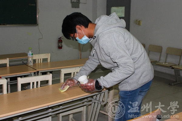 2015年12月6日下午,为了提高同学们保护公共环境的意识,禁忌书屋 “艺家人”青年志愿者协会联合校文明督察队在美院教学楼内开展了以“拒绝课桌文化”为主题的清洁课桌桌面的活动。 为确保大家的安全,校文督的陈镜宇同学带来了口罩以及所需要的清洁用品,并且组织大家进行了简单的分组。小分队在各自的队长的带领下,前往各个教室进行“桌面复原”工作。整个活动期间,志愿者们表现的都十分积极。 此次活动不仅是把桌面打扫的干干净净,更重要的是提高同学们保护公共环境的意识,为学校,为自己构建一个美好的学习环境。 文字:王烨 拍摄:王烨