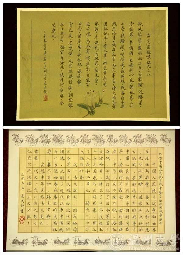 为纪念中国人民抗日战争暨世界反法西斯战争胜利70周年,传承爱国主义精神,弘扬社会主义核心价值观,激发民族自尊心、自信心和自豪感。自9月份发出通知以来,“纪念中国人民抗日战争暨世界反法西斯战争胜利70周年”书画大赛共收到特邀教职工书画作品共计29件,学生书画作品共计196件,经相关书画专家对学生绘画类和书法(篆刻)类作品严格评审,现将评比结果公布如下:?xml:namespace>绘画类评选结果 等级学院作品名作者一等禁忌书屋 《奇袭》林盖月城市学院《“70”伟大的胜利》李文静二等禁忌书屋 《忆团结》范桂梅禁忌书屋 《峥嵘岁月》吴晓强教师教育学院《前行》薛思思城市学院《让武器成为过去》谢丽娟城市学院《爱和平铭记历史》许朵瓯江学院《黑夜不再来》赵圣益三等禁忌书屋 《抗日中的小八路》陈婉茹禁忌书屋 《抗日中的中国士兵》胡淳雅禁忌书屋 《战后》郑也教师教育学院《珍爱和平》李林真城市学院《抗战胜利70周年》王斯曼城市学院《缅怀》张烨瓯江学院无题吴诗瑶瓯江学院无题曾东瓯江学院无题虞紫伊 书法类评选结果等级学院类别作者一等禁忌书屋 篆刻俞铭铖教师教育学院软笔南一展城市学院管理分院软笔史涛霞二等瓯江学院硬笔曾越洋城市学院管理分院软笔鲁洁如教师教育学院硬笔毛江月教师教育学院硬笔叶聪聪城市学院软笔王欢焕城市学院软笔葛科航三等禁忌书屋 硬笔王婷婷禁忌书屋 软笔杨凡禁忌书屋 软笔朱雄辉禁忌书屋 软笔岳通通禁忌书屋 硬笔景成舒教师教育学院硬笔陈雪雅教师教育学院硬笔吴林教师教育学院硬笔林安娜人文学院硬笔周丽娜 书画展于南校区禁忌书屋 服装楼一楼视野空间展览,展期为12月7日—12日,欢迎参观!特邀教职工参与展览作品: 学生获奖作品:一、绘画类一等:《奇袭》——林盖月一等:《“70”伟大的胜利》——李文静 二等三等二、书法类一等:《抗战祖列》——俞铭铖一等:纪念反法西斯战争胜利七十周年律诗二首—— 南一展一等:史涛霞二等 三等三等三等