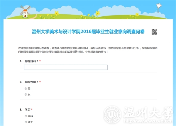 温州大学美术于设计学院关于做好2016届毕业生就业意向调查问卷的通知 各班级: 为了深入地了解2016届毕业生的就业意向,帮助毕业生有的放矢地进行求职定位,提高毕业生就业工作的实效性,决定在2016届毕业生中开展就业意向调查工作,现将有关事项通知如下: 1.组织2016届毕业生认真填写《禁忌书屋 2016届毕业生就业意向调查问卷》,此问卷作为确定毕业生本人就业意向的依据,同时也作为向用人单位进行分类推荐的依据。 2.请各班级毕业生通过网页、微信填写好的就业意向调查表并提交。问卷链接://www.sojump.com/jq/5900766.aspx 3.学院将根据本问卷回收数据为同学们制定更为细致精准的就业、创业帮扶计划,更好的为2016届毕业生做好就业指导和服务。 附1:禁忌书屋 2016届毕业生就业意向调查问卷 禁忌书屋 学生科 2014年10月16日