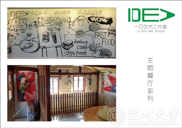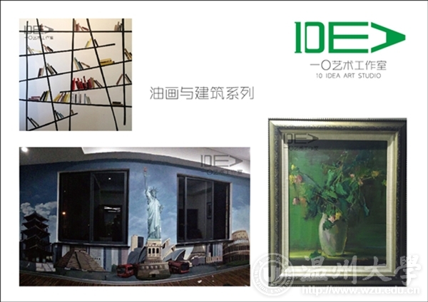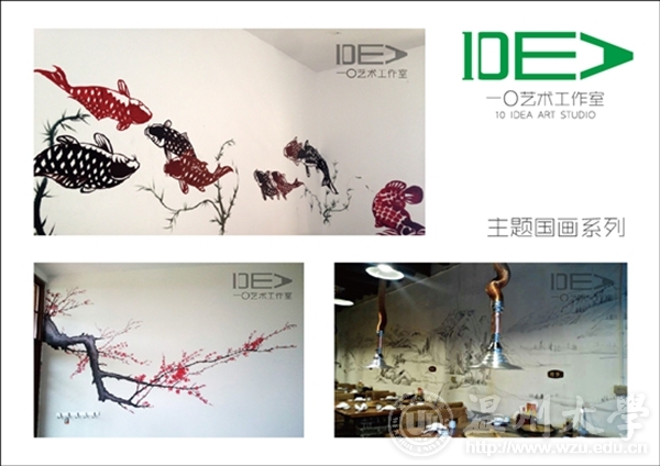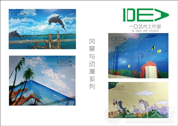 团队名称:一〇艺术工作室 负责人:吕舒宁 联系电话:18367810822 工作室简介 “一〇”艺术工作室成立于2013年,由禁忌书屋 油画、国画以及环艺专业的几位热血青年组成。以墙绘艺术创作,定做油画、国画为核心。秉承“一”是最简单的开始,“〇”是无限大的创意。我们只为用色彩点亮客户的艺术生活,为此我们以初心——永不止步。 工作室成员 吕舒宁、蒋成杰、郭龙、朱雄辉、陈情、林瑞恬、黄磊、顾天成、陈伟伟 经营业务范围 1.油画国画风景、人物类定做 2.室内室外墙体艺术彩绘 3.绘画作品临摹临摹(包括油画、国画、书法等) 4.平面设计 作品展示 创业感想 我们是大学生中的沧海一粟,我们曾彷徨,为不定的未来着急。绘画从来都是高贵的玩具,年轻的我们还拿不起。某个契机,看到了专业的缩影——墙绘。我们是专业的画手,我们有最新颖的想法,我们愿用热血呈现精彩的视觉享受。 细看生活不难发现随着经济的发展,人们开始追求上层建筑的享受,而绘画艺术必将广泛的进入我们的生活,已经成为一种生活的方式。我们知道翅膀硬的老鹰才能飞的更高,所以我们将明确目标,实事求是,执着追求,最终可以让所有人的生活变得更加美好。