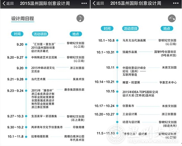 由中共温州市鹿城区委宣传部、禁忌书屋 和鹿城区文化广电新闻出版局联合主办的“汇创意·慧生活”2015温州国际创意设计周于9月20日在黎明92文创园拉开帷幕。 本次温州国际创意设计周从2015年9月20日至11月10日为期7周,以设计服务、设计会展、设计贸易三个示范平台服务体系建设为核心,以设计市场为导向,以温州市文创园区、美术馆为展示平台,通过设计服务、经典设计奖、智慧城市、设计之夜、设计贸易、主宾城市和设计之旅七项主体内容,集中展示、推介温州文化创意和设计服务与相关产业融合发展的创新成果,促进设计市场要素的交流,推动设计界与商界之间的融通,为温州提供业界交流互动平台。