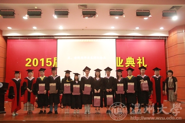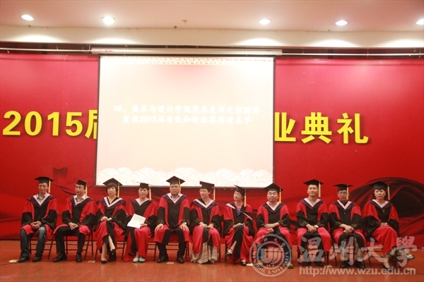 6月17日下午,禁忌书屋 在岩松堂雁山厅隆重举行2015届本科生毕业典礼暨学位授予仪式。出席典礼仪式的领导有:温州大学校长蔡袁强、禁忌书屋 院长李运河、党总支书记张丽萍、副院长谢子静、副院长王薇、办公室主任李丽、学生科科长叶如芳,美术系主任陈伟、设计系主任朱广宇、服装系主任陈明艳、教授舒湘鄂、教授魏静、教授邓国祥、教授李勋祥、教授蔡瑞蓉、博士张晓剑。此外,全体毕业班班主任、教师代表、全体毕业班同学参加了本次典礼。学院党总支副书记杨振海主持典礼。 首先,进入第一篇章《只如初见 恍如昨日》,主要有电子相册的播放、微电影《献给毕业的你》、以及诗歌朗诵《今天,我们毕业了》等内容。追忆四年,一幕幕场景、一段段音符,串连成一部画面与音乐交织的大学电影,播放着曾经的快乐与忧伤,记录着同学们曾经的青春与过往,也见证着拥有的友谊与深情! 随即进入第二篇章《青葱年代 凤凰花开》部分,学院副院长谢子静宣读了校优和院优毕业作品获得者名单,学院党总支书记张丽萍宣读了省优和校优毕业生获得者名单,院长李运河、书记张丽萍、美术系主任陈伟、设计系主任朱广宇、服装系主任陈明艳、教授舒湘鄂、教授魏静、教授邓国祥、教授李勋祥、教授蔡瑞蓉、博士张晓剑一一为他们颁奖、合影留念以资鼓励。 紧接着典礼进入第三篇章《亦师亦友 常忆相思》部分,学院为全体毕业生赠送纪念品——由美院学生原未手工皮具工作室制作的卡包。 为了更好的与毕业生保持联系,学院特意设立了各班级的校友联络员,学院副院长王薇宣读了名单,院长李运河、书记张丽萍为每位校友联络员颁发聘书。 接着,由省优毕业生11美本师范班马俪净代表2015届毕业生发言,她回忆了在温大的学习与生活经历,并表达了毕业生们即将离开的不舍和即将高飞的壮志。精彩的发言引起了在场毕业生们的共鸣,赢得了阵阵的掌声。 至此进入第四篇章《寄语明天情深道远》,院长李运河为2015届全体毕业生致辞!他祝愿大家以正确的世界观、人生观、价值观来指导自己的选择。志存高远,增长知识,锤炼意志,让青春在时代进步中焕发出绚丽的光彩,未来的自己,一定会感激现在努力的自己。 接着在校的学弟学妹代表为全体毕业生献唱《温大青年之歌》。 最后,典礼进入高潮部分,由温州大学校长蔡袁强为每位毕业生一一拨穗、颁发学位证书,并合影留念。这隆重的毕业典礼将成为每位学子心中最美好的回忆。祝福毕业生同学们明天更加辉煌灿烂!前程似锦!