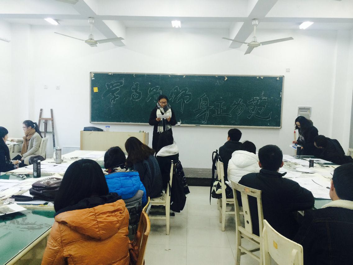 2014年12月22日,这个白昼最短的日子里,当夕阳的余晖照进我们教室的时候,赵春同学在黑板上写下了“学高为师,身正为范”几个大字,14美师班以此为主题的班会在班长王昱人的主持下宣布开始了!本次班会由班主任陈菽现老师提议,我们14美师全体班委共同策划,邀请了禁忌书屋 史论教研室主任、研究生办主任、师范专业负责人胡建南老师和12级美师的学姐吴王琳同学参加。班会旨在通过专业老师的指导、新老生的交流,使得同学们更加了解自己的专业以及做好大学的规划。