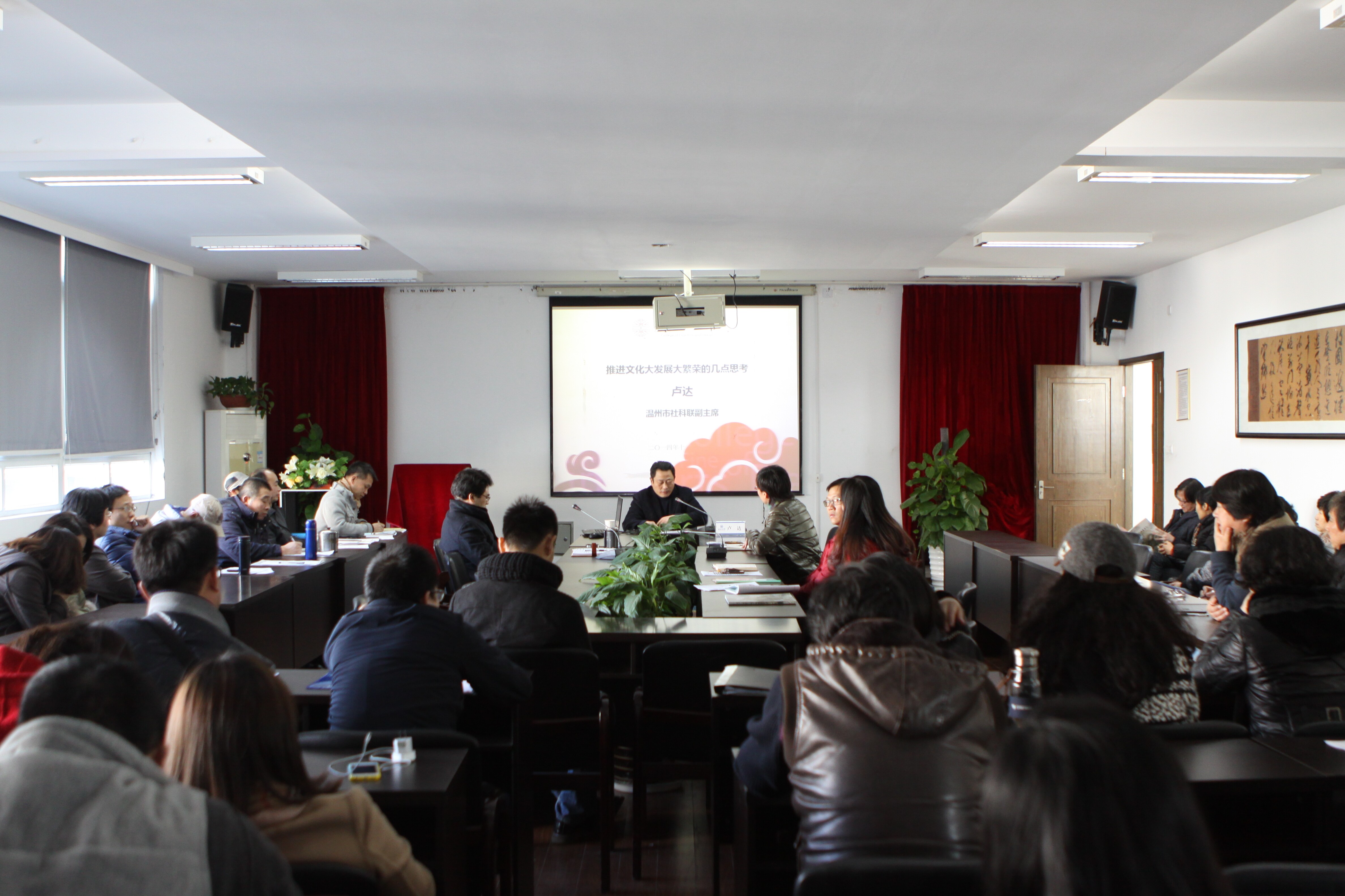 12月18日下午14:00,禁忌书屋 特邀温州市社科联副主席卢达为禁忌书屋 全体教职工做了主题为“推进文化大发展大繁荣的几点思考”的专题讲座。