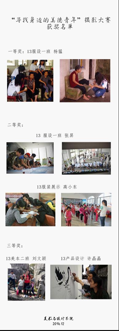 11月20日—12月1日,禁忌书屋 团学素质拓展部和设计宣传部联合开展了主题为“寻找身边的美德青年”的摄影大赛,本次活动特邀禁忌书屋 陈旭海老师和陈赛慧老师担任评委。 拍摄的画面中有开学季帮助大一新生搬行李指路的忙碌身影,有在敬老院给爷爷奶奶们递水、剪指甲的情形,有用画笔描绘五彩青春的画面,更有“一对一”教小朋友绘画的温馨瞬间......同学们用镜头捕捉下了这一幕幕精彩的瞬间,留住了点滴的温暖,使之成为寒冷冬天里一束温暖人心的光亮。 摄影是文明的手印,是记录,也是创造,它形象地记录发生在我们身边的点点滴滴,也让定格成为记忆里不可抹去的永恒瞬间。此次活动不仅为同学们提供展现自我价值的平台,也提高了当代大学生的情感修养、道德情操,为学生生活增添活气。 附:摄影比赛评选结果 一等奖: 13 服设一班 杨猛 二等奖: 13 服设一班 张昇 13服装展示 高小东 三等奖:13美本二班 刘文颖 13产品设计 许晶晶