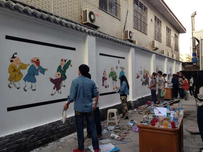 10月25日,禁忌书屋 “艺家人”青年志愿者协会和温州怡乐如老人公寓合作举办了“为老人添一抹色彩”墙绘活动。墙绘均以“孝悌忠信,礼义廉耻”为主题,总共有30多名志愿者和青协成员参与了此次活动。 此次活动主要是对怡乐如老人公寓里的7面白墙以及一扇门进行墙面设计。活动开始后志愿者们并没有急于开始墙绘,而是对房间布局,老人喜好进行了观察了解,初步统一了墙面的色调以及大小。随后将所有志愿者以4—5人为一组分成八组负责各自墙面。志愿者们结合专业认真绘制,很快一幅幅墙绘作品就呈现在大家面前,成为社区中一道亮丽的风景线。灰头土脸的围墙经过志愿者的巧手焕然一新,让志愿者感觉生活在了一个新社区中。尽管时间紧促,各组志愿者组内却能做到各自合理分工、相互合作,有的人定形,有的人上色,有的人修改,在规定时间内保质地完成了墙绘工作,得到了公寓负责人和老人们的一致好评。 志愿者们通过此次活动理解了团队合作的重要性,加深了关爱老人的意识,也进一步弘扬了志愿者精神。也希望通过“孝悌忠信,礼义廉耻”主题的绘画创作,传递中华传统美德,渲染关爱老人的氛围,无形中感染周围的居民,为创建和谐社会做一份贡献。