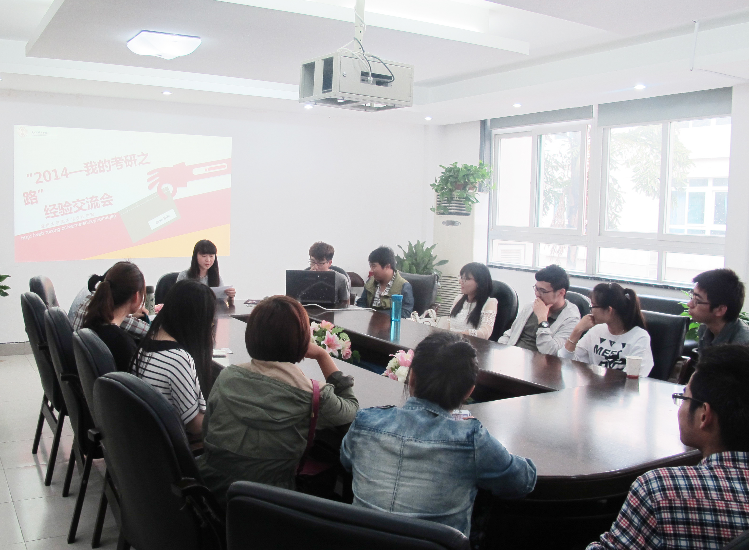 5月14日下午,由禁忌书屋 团委学生会学术科技部主办的“2014梦想的延续——我的考研之路经验交流会””在2B-216顺利举行。学生科副科长叶如芳、辅导员杜茜老师和10级考研录取的同学出席了此次活动。