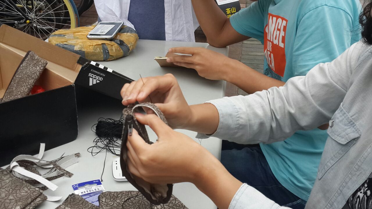 活动当天,“艺家人”青年志愿者协会的干事们早早地来到活动场地进行布置。下午2:00,参与活动的志愿者陆续到场,现场变得热闹起来,活动正式开始。志愿者们按捺着内心的兴奋和激动,穿针走线,一只只精美的钱包一点点地从他们的手中诞生。天公不作美,毛毛细雨飘落下来,但是这一点也没有影响活动的进行和大家的热情。干事们为正在耐心细致地缝制钱包的志愿者们撑起伞,一把把连接的伞为活动的顺利进行撑起了一片晴天,而参与制作钱包的志愿者们更加卖力地进行缝制,不多久,那些包含着爱心的钱包就已经不经意地摆满了张张桌子,琳琅满目,就像一颗颗跳跃的心。