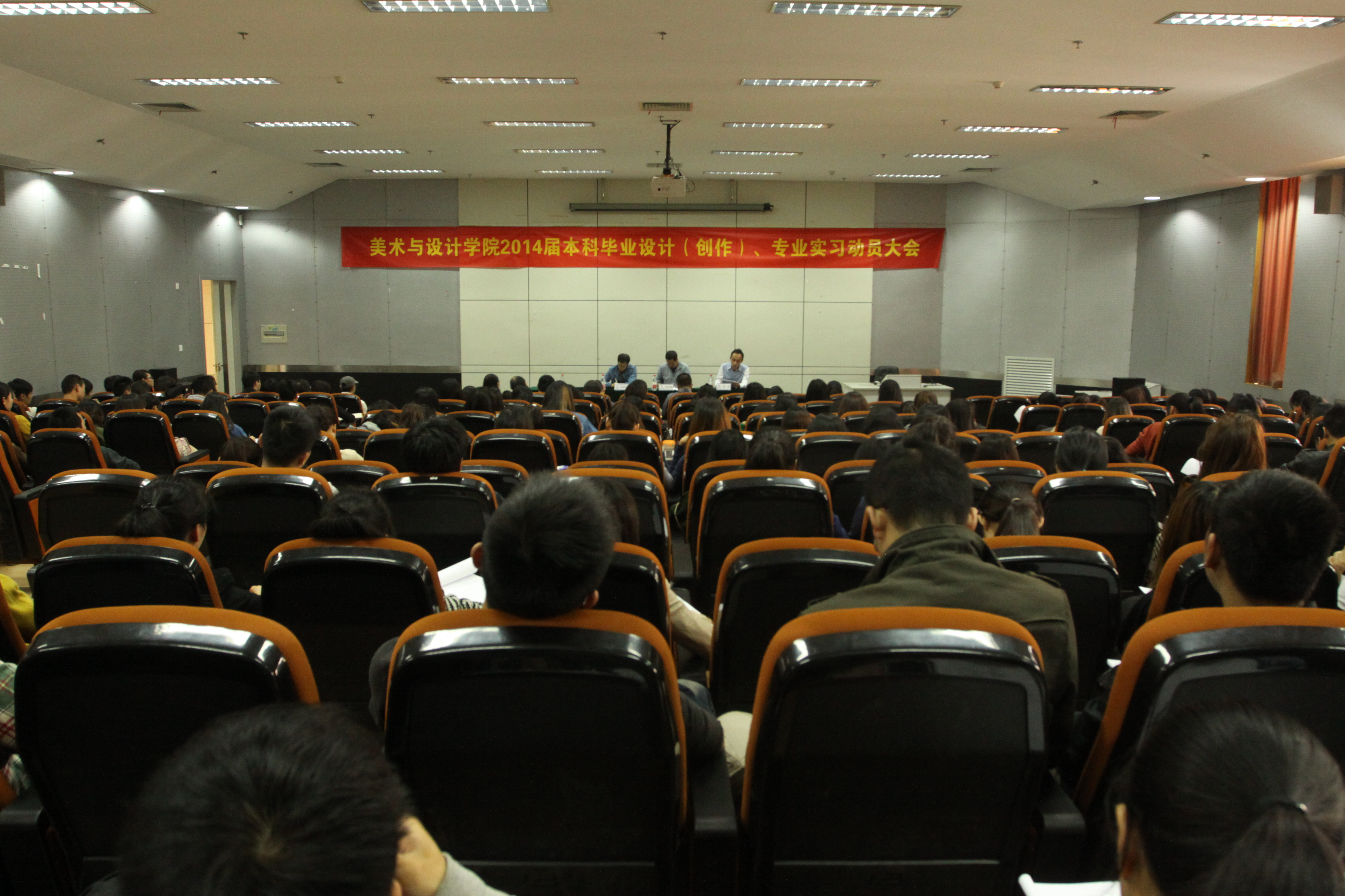 为顺利开展2014届毕业设计工作,11月8日上午,禁忌书屋 2014届本科毕业设计(创作)、专业实习动员大会在学校会展中心叶适厅举行。学院副院长蔡可群老师,副书记杨振海老师,教学科邹青老师,及美术、设计、服装三个系的系主任、各位毕业设计指导老师及全体14届本科毕业生参加了会议,会议由邹青老师主持。