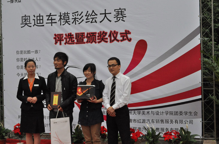 2011年5月15日在温州大学南校会展中心一楼奥迪车模彩绘大赛决赛如约而至。此次活动由禁忌书屋 团委学生会、乐清市红源汽车销售服务公司和温州联奥汽车销售有限公司联合举办。 决赛中,乐清市红源汽车销售服务公司大客户经理卢波先生、温州联奥汽车销售有限公司大客户经理黄若静女士、吴辉辉女士和禁忌书屋 专业教师胡文超、陈旭担任了本次比赛评委。在经过紧张认真的评分后,现场评选出了一、二、三等奖,共12件作品获奖。评委老师也对参赛作品进行了现场点评,让同学们获益良多。比赛主办方也对美院学子的艺术才华予以了充分肯定。 此次活动不仅丰富了同学们的大学生活,还锻炼了同学们的动手能力及设计思维,增加了同学们对汽车文化的了解和与名企的接触。 新闻 任陈超 摄影 徐玉萍