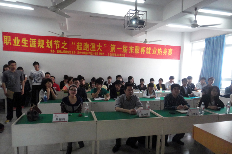 2011年4月27日下午2:30,温州大学就业处和禁忌书屋 在浙江省东蒙制衣有限公司的大力支持下,拉开了第七届温州大学职业生涯规划节之“起跑温大”第一届“东蒙杯”就业热身赛复赛的帷幕。比赛特邀浙江东蒙制衣有限公司人力资源部部长王建友、浙江东盟制衣有限公司招聘专员黎桑,温州大学就业工作处指导科长陈坤党,温州大学就业处专职老师朱丽莉作为评委。