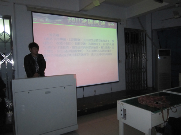 刚刚过去的三月,举世瞩目的十一届全国人大四次会议和政协第十一届全国委员会第四次会议在北京人民大会堂隆重召开,并取得圆满成功。为更好地学习和温习两会精神,提高党员的政治素养和政治觉悟,禁忌书屋 学生第三党支部于3月31晚在学院2A306举行了一场别开生面的两会知识竞赛。