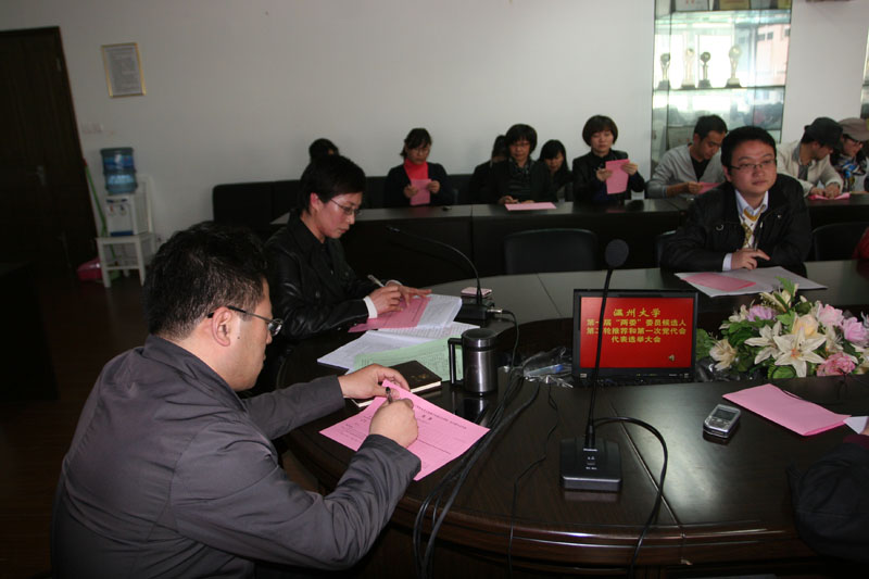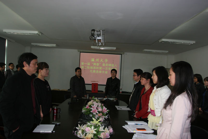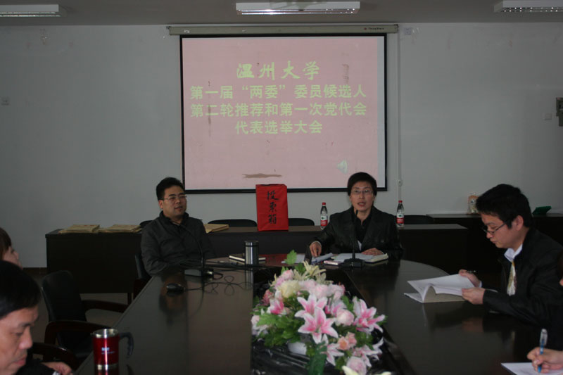 大会在庄严的国歌声中开始。根据大会议程,首先由党总支书记郑彩莲同志宣读了《中共温州大学第一次代表大会代表选举办法》和校党委批复的8名出席党代会候选人名单,同时,大会以举手表决的方式一致通过了总监票人、监票人人选。