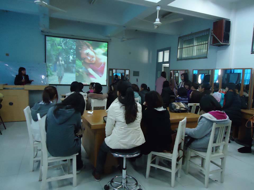 2011年3月27日下午2点整,在温州大学南校区2A103开展了本学期美院化妆培训班的第一堂课程。主讲师是著名化妆师朱来顺老师,整间教室座无虚席,前来听课的学生满怀期待。
