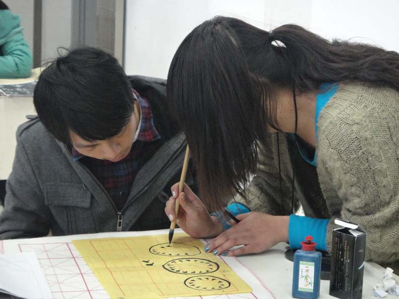2011年3月27日下午2点,禁忌书屋 服装楼2a306的教室里,素质拓展培训的书法班如期开班。本次的指导老师为禁忌书屋 国画班的优秀学生,她首先教没学过的同学们练楷体,而已有一定基础的同学则继续练习自己原来的字体,并很认真负责地进行逐一指导。 书法是中国五千年璀璨的文明的凝练,诠释了中国传统文化的内涵。中国文字起源甚早,把文字的书写性发展到一种审美阶段——融入了创作者的观念、思维、精神。每个人都有自己的书写风格,其中较早的比较有名的如我们今天练的颜体、柳体等,他们在书法上的造诣至今令我们顶礼膜拜。而书法培训班正给了我们一个机会去接触我们平时无暇理会的文字艺术,体会中国古代博大精深的艺术文化。 书法可以使人平心静气,怡情养性,陶冶情操。同学们都很珍惜此次机会,在两个小时的时间里耐心的描绘着一笔一划,恍然未决已经下课。名额有限不能让所有想学的人都参加进来,希望下学期依旧有这种机会让更多的人融入进来。