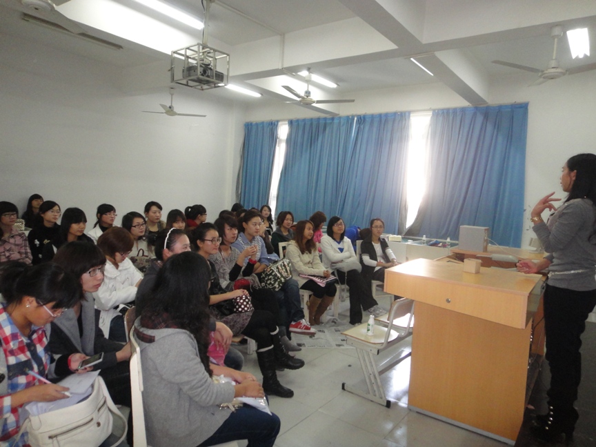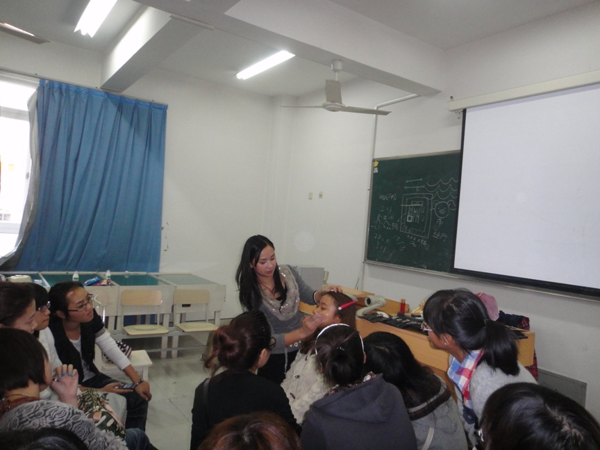 2010年11月20日星期六14:00~16:00,在美院2B3001,雪思美容院院长、医学院WinGirl俱乐部指导老师朱来顺,为禁忌书屋 的化妆培训素质拓展班画上一个完美的句号。 此次培训是朱老师在本学期第四次给大家辅导。其热烈的掌声,阐释着大家对本次培训的渴求和对朱来顺老师的喜爱。朱老师说,化妆是艺术。她要求人们在化妆之前先了解自己今天穿了怎样的服装,代表着怎样的形象以及自己的性格;希望每个人能了解自己面部的优点和缺点各是什么。然后,她让同学来当模特,一步一步地教同学们怎么样打底、修眉、调肤色、画眼线、眼影、腮红和唇彩。而同学们也是热情高涨,积极提问,踊跃参与其中。在示范的过程中,她也再三强调该注意的地方。比如定妆时要用散粉,补妆时要用粉饼,刷子半年洗一次,而在平时,只要用散粉洗就可以了……示范结束后,她则让同学们自己亲手实践。 这次培训,不仅让爱美的女生体验到了化妆带给她们在外表上的飞跃,更是让她们学习到了化妆的真正技巧。