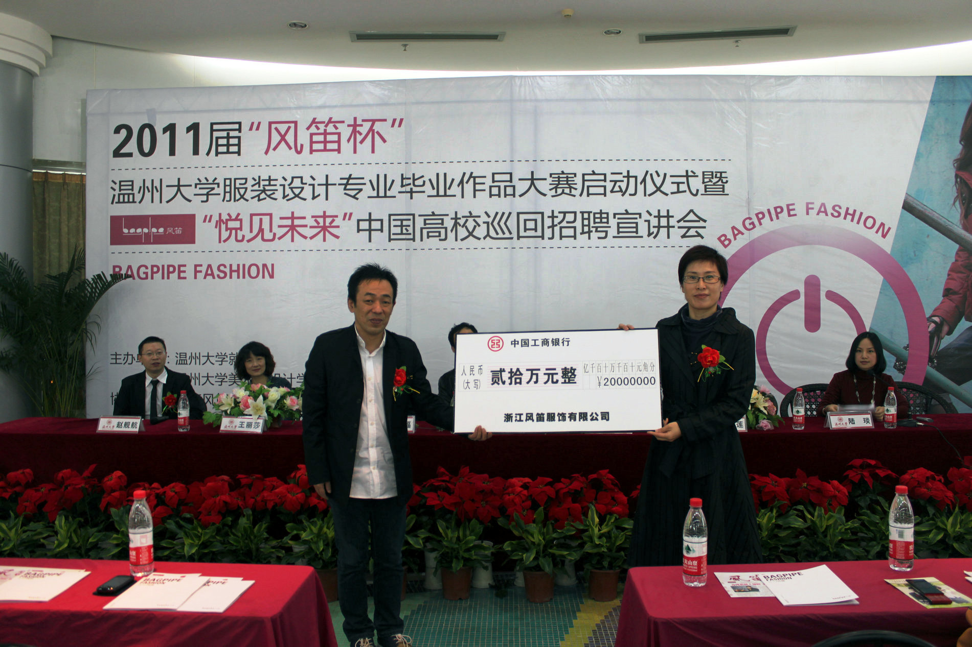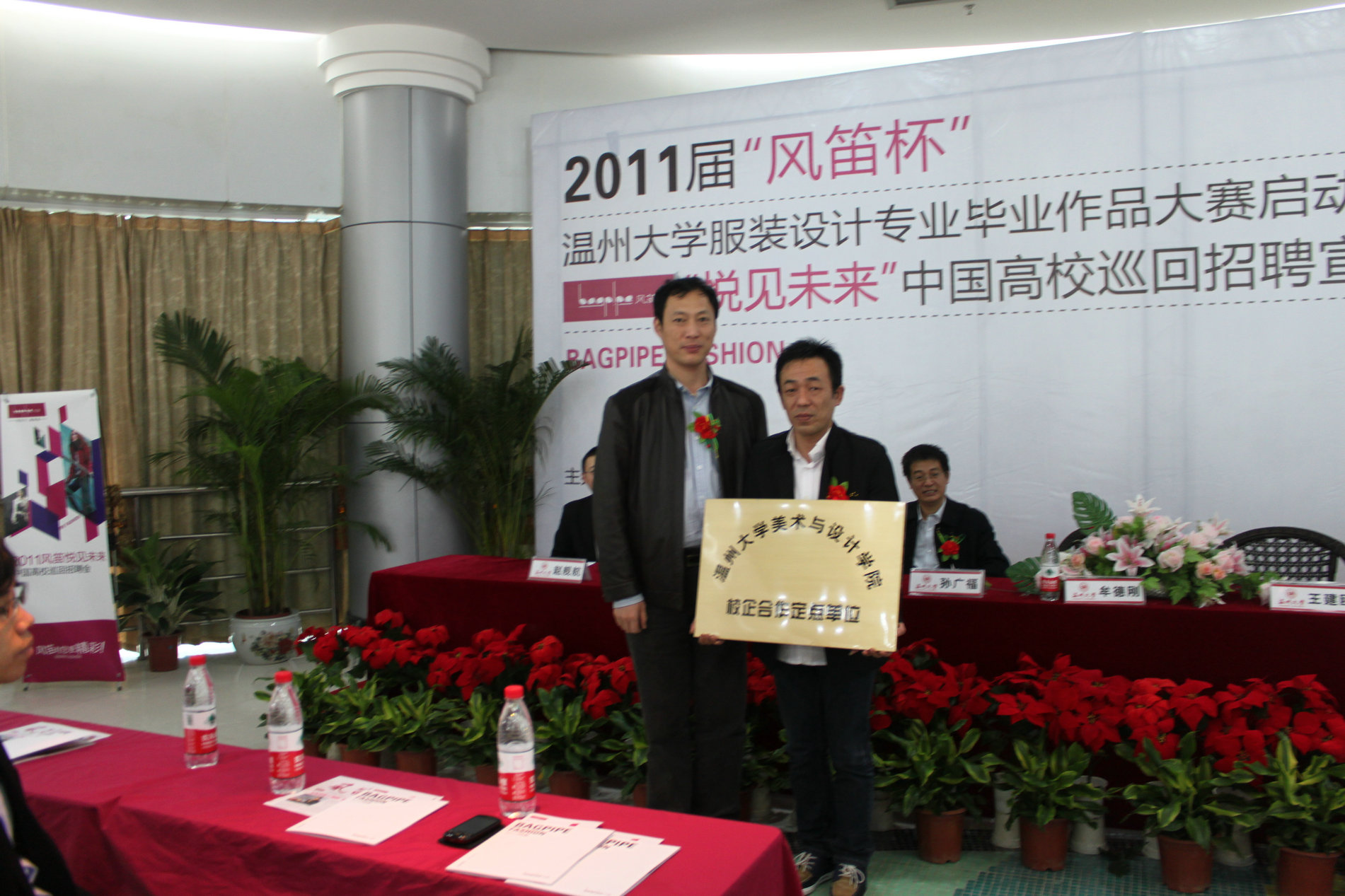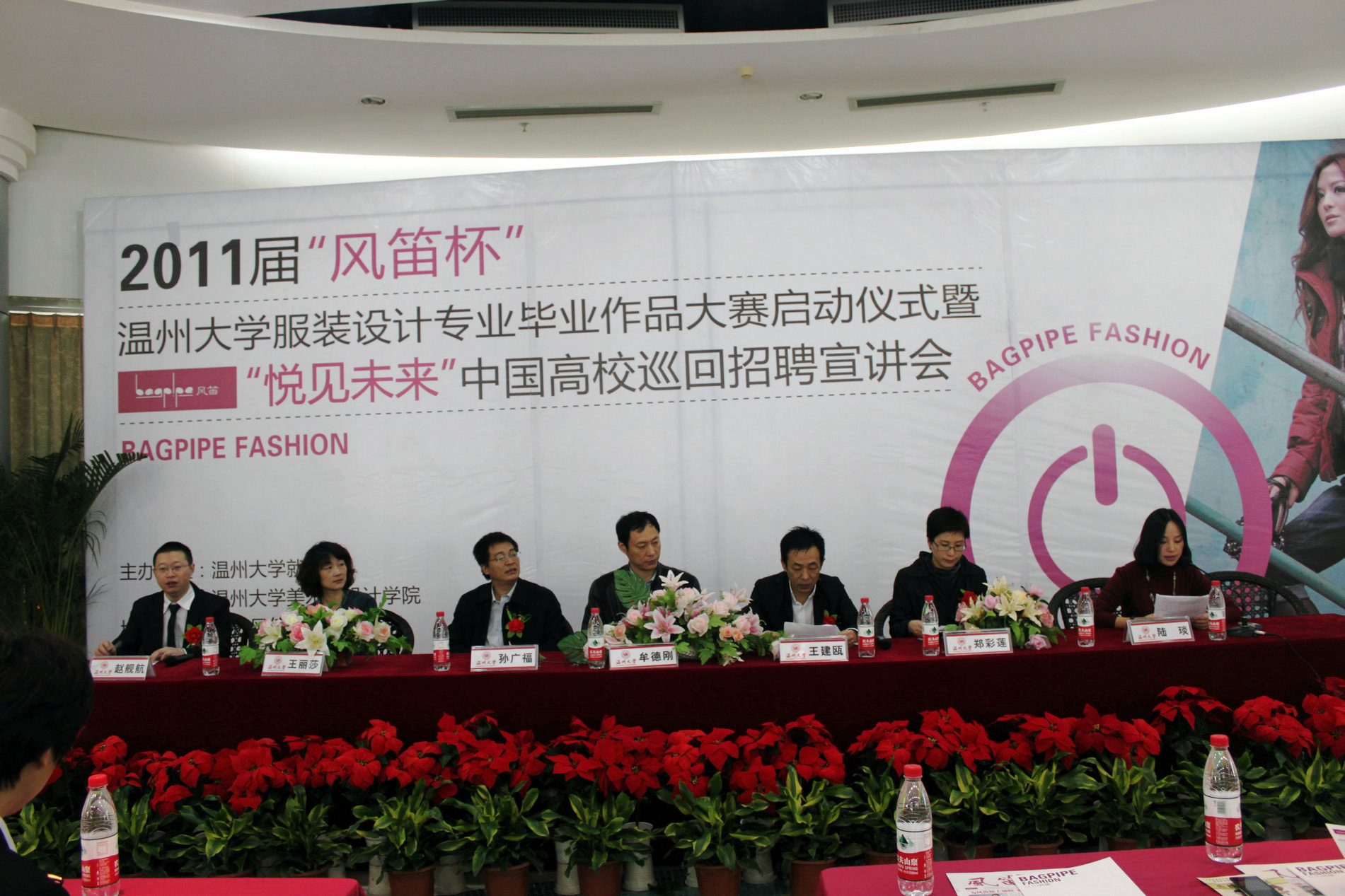 2010年11月21日上午九点,由温州大学就业处和禁忌书屋 联合主办的2011届“风笛杯”温州大学服装设计毕业作品大赛启动仪式暨“悦见未来”中国高校巡回招聘宣讲会,在大学生活动中心茶吧隆重举行。温州大学党委副书记牟德刚、温州大学就业工作处处长孙广福、禁忌书屋 党总支书记郑彩莲、浙江风笛服饰有限公司总经理王建瓯、首席设计师王丽莎、人资中心总监赵舰航出席了启动仪式,会议由禁忌书屋 服装设计教研室主任陆琰主持。参加本次活动的还有禁忌书屋 全体服装系学生。