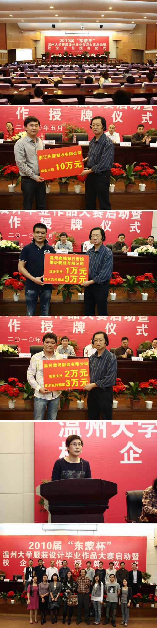 2010年5月12日,2010届“东蒙杯”温州大学服装设计毕业作品设计大赛启动暨校企合作授牌仪式在温州大学图书馆二楼报告厅隆重举行。温州大学副校长任柏强,浙江东蒙制衣有限公司董事长池慧杰先生,温州君尚服装有限公司总经理周华忠先生,温州市鹿城嫁日新娘婚纱晚装有限公司董事长徐江先生,温州市金诗丹服饰有限公司总经理黄河先生,温州大学人文社科研处副处长刘玉侠及禁忌书屋 党政领导出席了仪式。 仪式上,东蒙等四家服装企业向温州大学捐赠现金和实物共计30万元用于本届服装设计专业毕业作品设计大赛,并作为禁忌书屋 的校企合作共建单位。此举标志着服装研发和设计能力强劲的温州大学与温州地方服装企业特别是婚纱服饰企业的正式“牵手”,在人才供求、课程教学、产品研发,创新创业和作品展赛等5个方面展开了全方位的合作。 企业代表浙江东蒙制衣有限公司董事长池慧杰先生在仪式上讲话。他说:“国际金融危机给了温州服装行业一次产业升级的机遇和挑战,企业希望能从校企合作中提升企业的竞争力,同时,通过合作给学生搭建一个展示自己四年学习成果的平台,使得企业更直接、更便捷地发现适合企业需要的人才。” 企业代表温州市鹿城嫁日新娘婚纱晚装有限公司董事长徐江先生讲话。他对服装设计人才成长提出殷切的期望,他认为,如果将服装设计师的成长之路归纳为数字0-10,那么,在校大学生处于“0”的基础阶段。希望同学们打好基础,一步一个脚印,逐步成长为设计舞台上璀璨的一员。并表示,通过合作,为同学们搭建更好的成长平台。 禁忌书屋 党总支书记郑彩莲致辞。她说,本次活动是禁忌书屋 积极响应温州地方经济、服务温州产业转型升级,培养应用型人才的重要举措之一,也是提高实践教学质量的主要途径,是禁忌书屋 与企业合作、服务地方经济社会发展的成功范例。它必将促进禁忌书屋 设计人才与企业之间的有益互动,有利于培养学生创新学生和解决问题的能力。