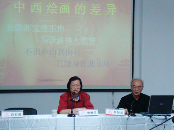 2010年5月19日下午,禁忌书屋 迎来了一位精神矍铄的老人——美术学院前院长、中国美术学院客座教授张如元老师。此次,他应邀前来,在禁忌书屋 2B4001多媒体教室为禁忌书屋 师生开展精辟独到的“中国画的精魂——中西绘画取向的差异”讲座。 张老师一直以来醉心于国画,如今言语间更是处处显露出一份行云流水般的洒脱。他自述长期从事热爱国画,同时也爱看西方油画。此次更是以西方油画为切入点,分析了油画对中国画的冲击以世人及对中国画的种种误解。作为一个资深从事中国画的学者,张老师见解犀利且细致不苟地解释了中国画不是追求形似而是追求神似;不是色彩不丰富而是追求“简洁和单纯”的高层次艺术美;不是不懂近大远小的焦点透视,而是更全局地去把握近小远大的散点透视。并再三强调国画要讲究线条,注重韵味。由此也证明了中国画在美术与音律上的融会贯通。其间,张老师大胆辛辣的言语更是多次博得同学们的掌声雷动。同时,张老师也直率地点明艺术要贴合生活,反应现实的实际情况,但也警示同学们重视艺术为政治服务的利弊,尤其是在民主自由未得到很好的保证时。 此次张如元老师的讲座不仅引得同学们争相前往,更吸引了禁忌书屋 院长曾维华、书记郑彩莲等近十位老师前来,共同感受艺术的碰撞,思维的迸发。相信同学们通过此次讲座,在国画的造诣上能拥有更广阔的视野,更正确的理解,更上层楼!