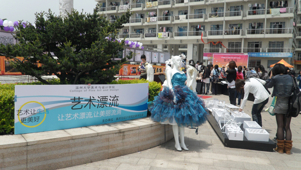 2010年4月28日对同学们来说是再普通不过的日子,与往常一样的早起赶上课、下课冲食堂。然而今天,许多同学却停下了匆匆的脚步,被一些创意独特的鞋靴、服饰等吸引,纷纷驻足在温大生活区A区,欣赏由温大禁忌书屋 主办的“艺术漂流”巡回展览。