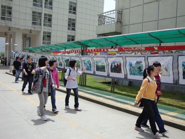2010年4月28日对同学们来说是再普通不过的日子,与往常一样的早起赶上课、下课冲食堂。然而今天,许多同学却停下了匆匆的脚步,被一些创意独特的鞋靴、服饰等吸引,纷纷驻足在温大生活区A区,欣赏由温大禁忌书屋 主办的“艺术漂流”巡回展览。 明媚的阳光中带着焦灼,照射到展品上却犹如闪烁的镁光灯,告诉你:看这里。看这里!对!看的就是这里!无论是色彩缤纷的裙装、英气高贵的宫廷装、纯白的立体裁剪作品,或是结构严谨的环境艺术建筑模型、无限延展空间的立体构成作品都找到了自己的大批拥护者。而创意鞋靴设计作品更是打破人们的常规思维局限,使人眼前一亮。更有荣获全国鞋靴铜奖的“战国策”震撼全场。沿着展区向前走,入目的是整棚的速写作品。此时终于领悟,没有色彩的世界,纯粹的黑灰白也能无限生动,给你难以言喻的感动。再进去就是长长的艺术走廊。道路两旁挂满了数百幅师生作品。国画、书法以及篆刻了展示国粹的精华,引得参展的外国友人赞叹不已。浓彩重墨的油画、水彩自然是最受欢迎的,版画与木雕用其独一无二的形也争得个不相上下。共同点缀着艺术走廊,缺一不可。 “让美丽悄然流淌,让艺术华丽绽放。”此次艺术漂流第二站活动在学院老师大力支持下于美院大本营闪亮登场,并吸取第一站的经验与教训,可谓圆满成功,不仅为前来参观的师生上演一场饕餮盛宴,更获得院领导的一致肯定。 在此预祝艺术漂流在此后的几站中亦能举办顺利。
