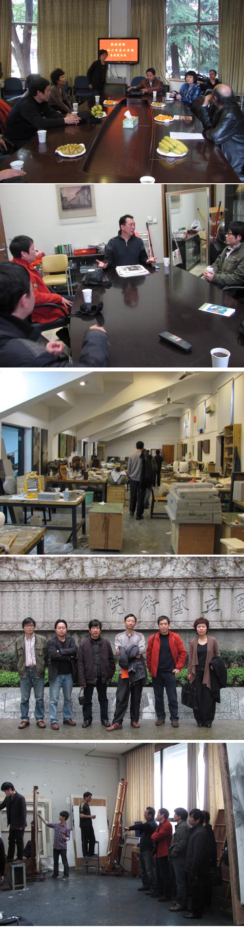 3月30日至4月2日,正值春暖花开时节。美术系蔡可群、蔡瑞蓉、邓国祥、黄良、梁力宏、黄良珽、丁海涵等七位教师,北上进行了为期四天的教学交流考察。 3月30日,第一站先到金华,作客浙江师范大学美术学院。浙师大美院教学骨干及教学副院长等人热情接待,双方进行了长达两小时的教学与办学思路交流,参观学院国画临摹室、展厅、专业教室。 3月31日早上,拜访中国美术学院油画系。由油画系主任杨参军教授带领,参观美术学院历史悠久,在国内颇负声望的四大油画工作室。杨教授绘声绘色地介绍自己的教学方法与艺术思想,令大家深感受益匪浅。 是日下午,七人又马不停蹄地前往考察杭州师范大学美术学院。校方早已开启喷泉,安排人员进行接待。管建新副院长、陆琦教授、学院书记等人在会议厅热情接待。由孔耘教授讲解,观看摄制精美的纪实录像,全面介绍杭师大美术学院的专业建设与前景规划,令人耳目一新。其办学思路是,突出绘画的品牌效应,加以设计专业的拓展,形成鲜明的办学特色。市政府与校方对美术专业的特色办学予以大力支持,学院得天时、地利、人和之势,近年发展迅速。随后,参观学院美术馆,该美术馆为杭州市的标志性建筑,设施完备,气势不凡。 4月1日早上,考察位于中国美术学院象山校区的壁画系,参观了漆艺与湿壁画工作室,特色工作室效应显著,在读的多名学生入选五年一届的全国美展。下午,拜访位于凤山路艺术创库区的杨参军绘画工作室,大家惊讶于杨教授创作的勤奋,教学相长的师者风范。 4月2日,春风和煦。满载观感与心得,七人自驾车子,越过钱江大桥,回到瓯江之畔的温州大学。