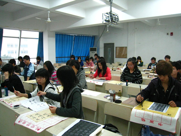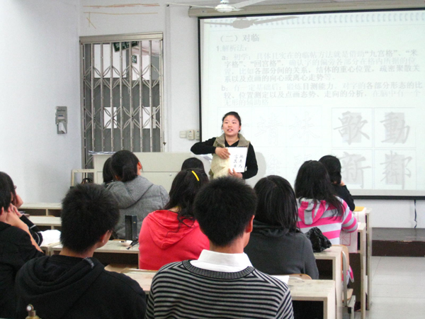 为了让大学生更好的接触并了解优秀华夏民族文化,结合学院教学特色,禁忌书屋 素质拓展书法培训班于4月11日下午两点在美术楼2A308顺利开班,并由有作品入选温州市第五届妇女书法展的何玲珑同学执教。 来自温州大学各个学院热爱书法的同学们,整个课堂都充满了乐趣。从书法的分类到发展历史,同学们深深感受到了书法的源远流长与博大精深。在授课的过程中,在何玲珑同学的带领下根据学生之间的功底差异,因材施教,从坐姿与握笔姿势,大到每个字的运笔规律,都十分细致的进行了讲解,并与学员们进行积极互动。虽然很多是初学者,但在墨香浓郁氛围的感染下,都表现出了很高的兴趣,很快进入了聚精会神的状态。经过短短两个小时的学习,每一位参加培训的同学都受益匪浅。 书法是我国独有的艺术形式,是中国传统美学的基础,凝聚着中华五千年的历史精髓,蕴含了文人义士不同的精神意念,陶冶情操。此次书法培训班面向整个学校招生,使更多的书法爱好者可以领略到书法的魅力,让作为炎黄子孙的我们将这种古韵精髓永远传承下去。