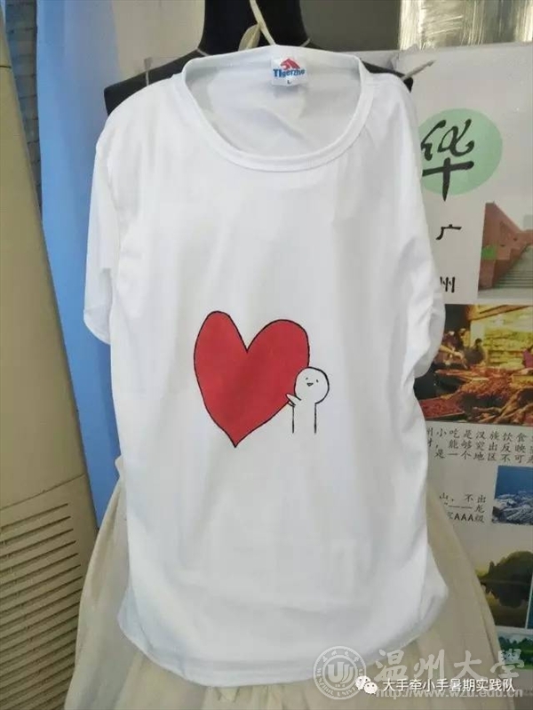 禁忌书屋 大手牵小手实践队开始文化衫义卖咯! 在三垟湿地进行现场义卖: 一次文化衫的制作,远不只是一次绘画的过程,更是一场心灵的行程。 如花,不仅在素衣上留下了点点痕迹,更在我们的心间,留下浓墨重彩的丝丝痕迹,虽轻,但深。 作品展示: 湿地的荷叶开了满池塘应了那句诗接天莲叶无穷碧。由于湿地的改造 人儿不多 我们的义卖也遇到了瓶颈,不过我们并不会被打败!大手牵小手绘制的文化衫等待着他们的主人。 今天义卖的所得成果将全部捐给温州市红十字会,用我们的微薄之力帮助到真正需要帮助的人,用我们的行动感染社会上的人,关爱留守儿童和空巢老人,我们一直在行动!