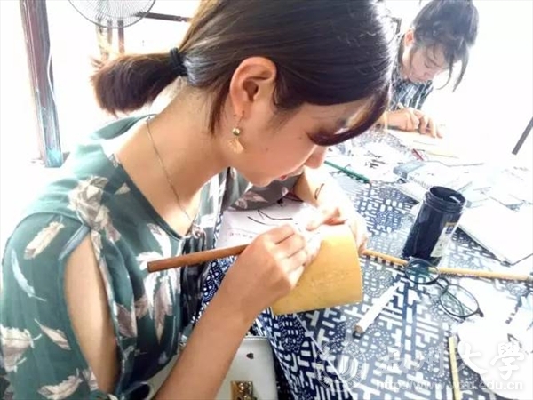 经过专业老师的指导,大家便尝试着进行笔筒木刻。